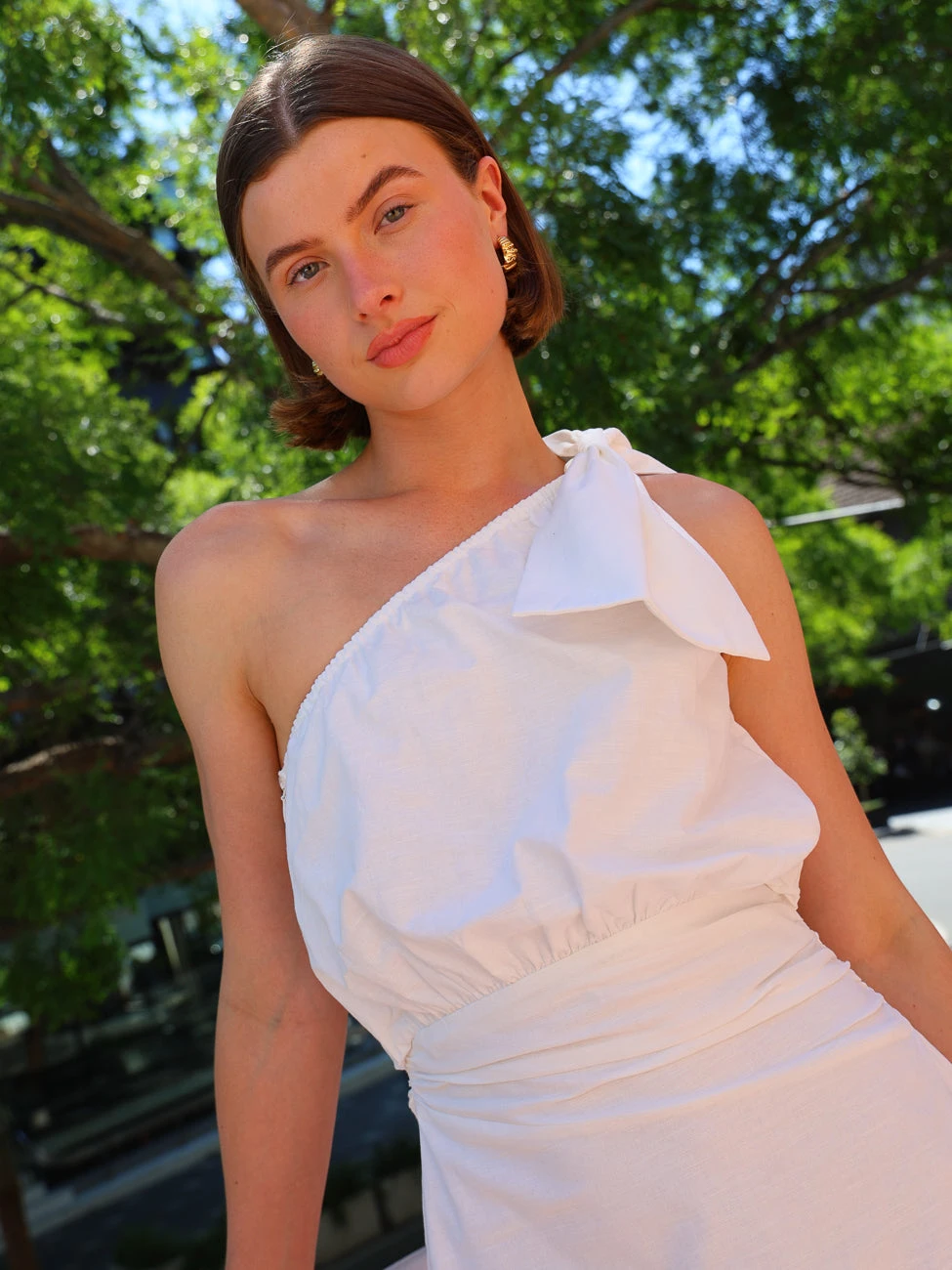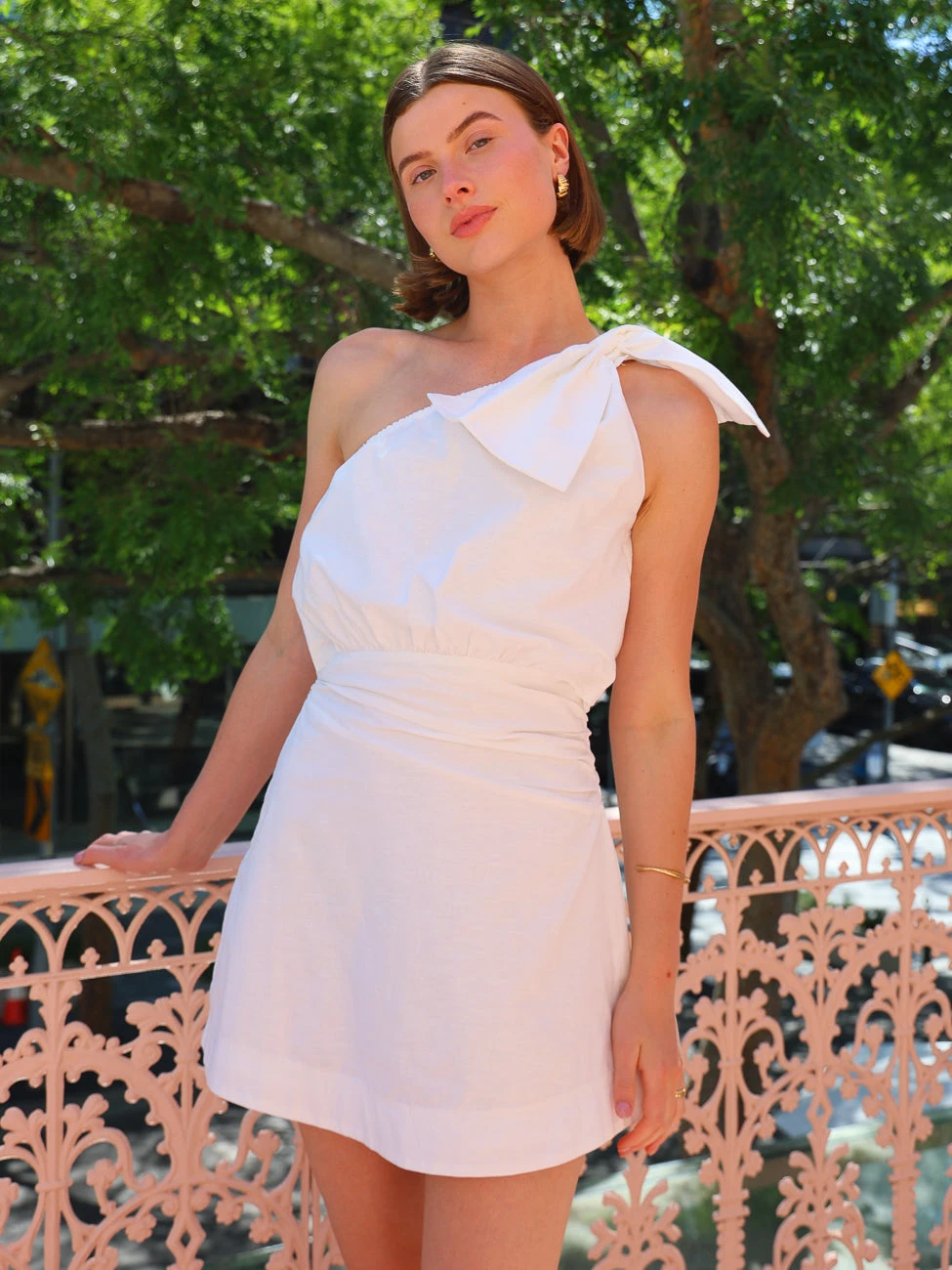 The By Nicola Amelie One Shoulder Mini Dress in White is a Coco classic, making it the perfect choice for wedding celebrations and special occasions. This stunning one-shoulder mini dress combines elegance with a modern twist, designed to make you shine.