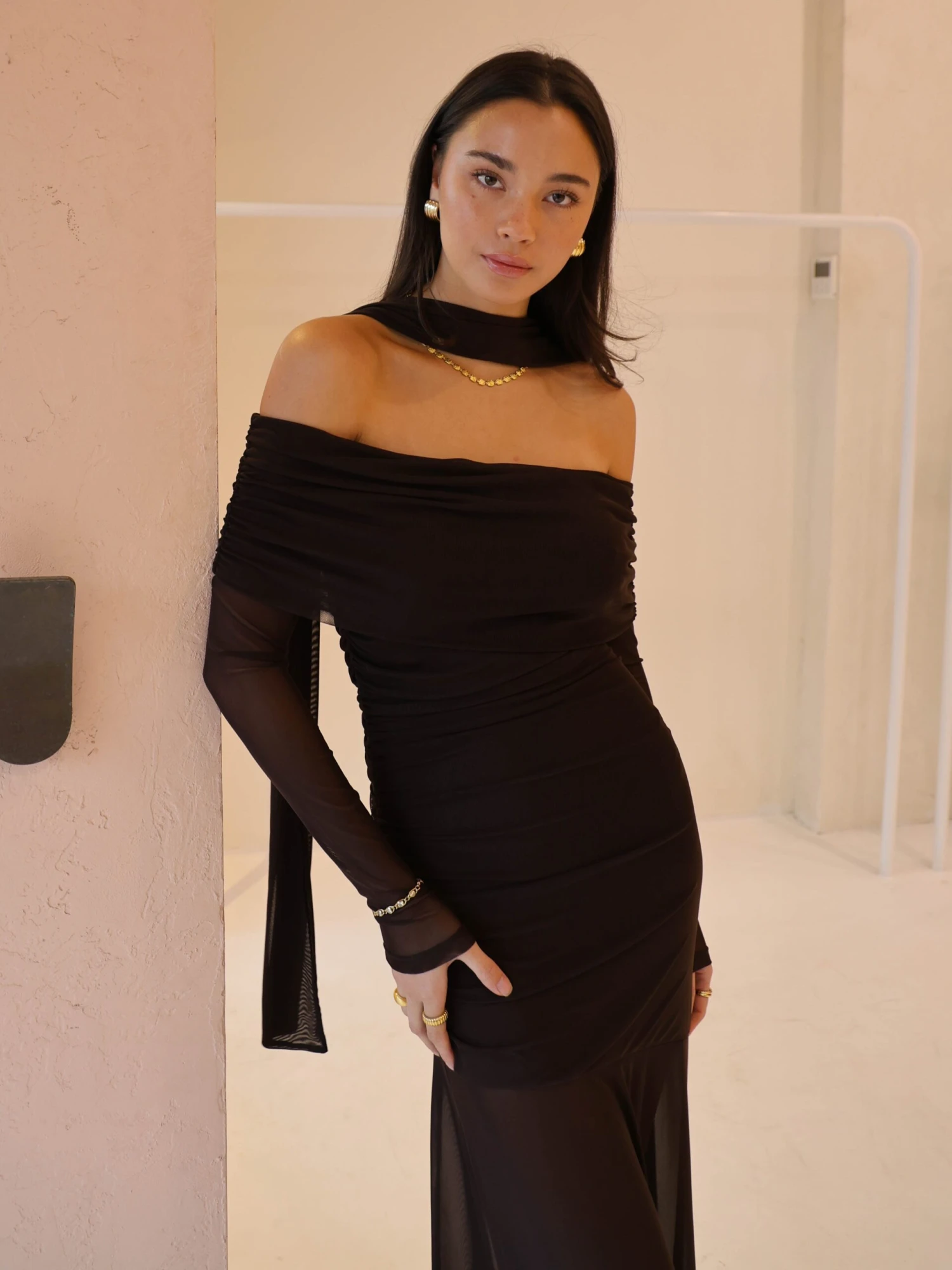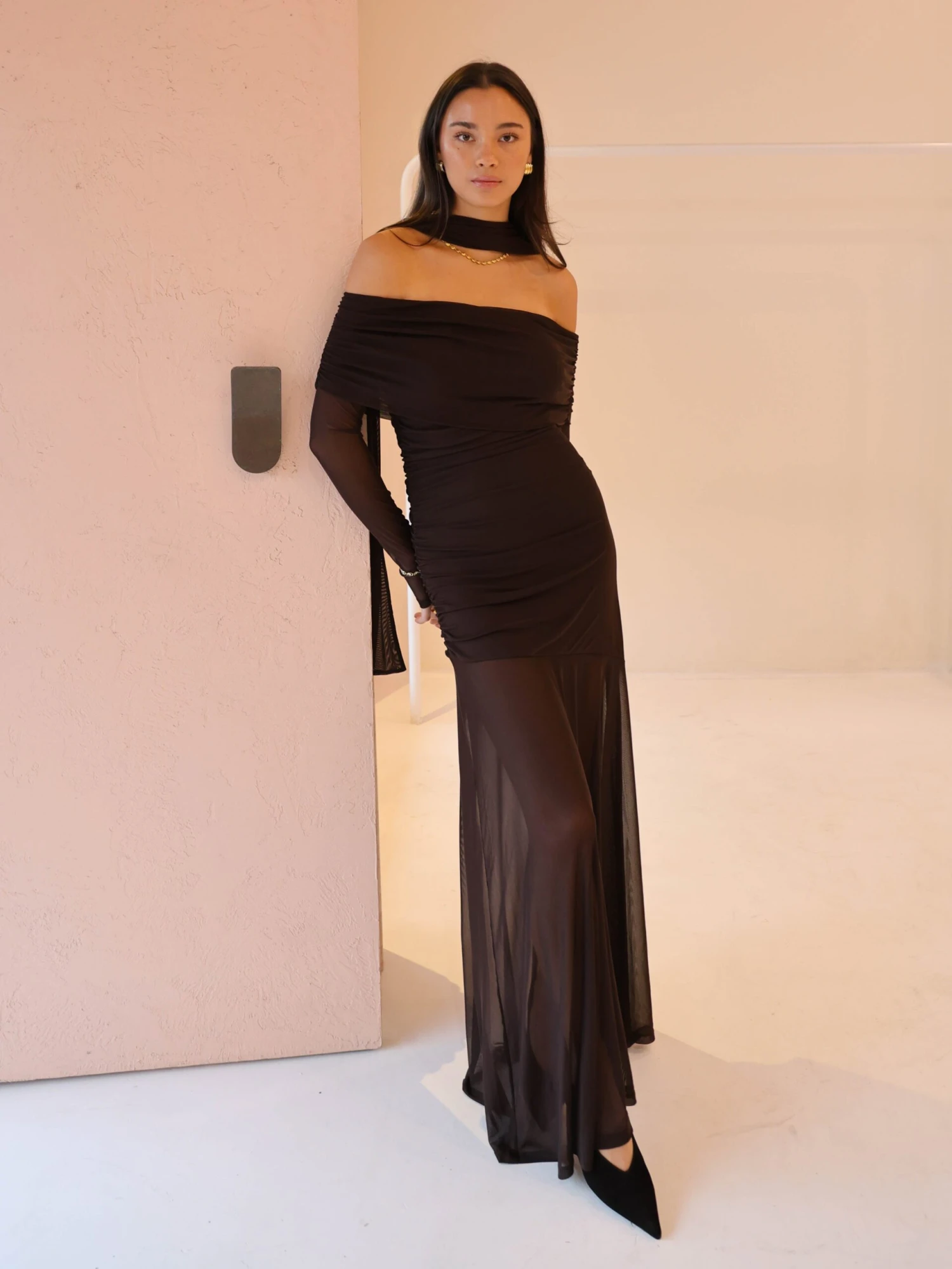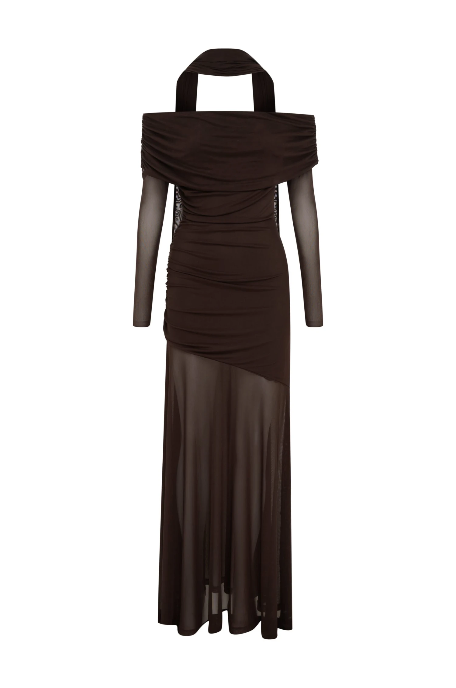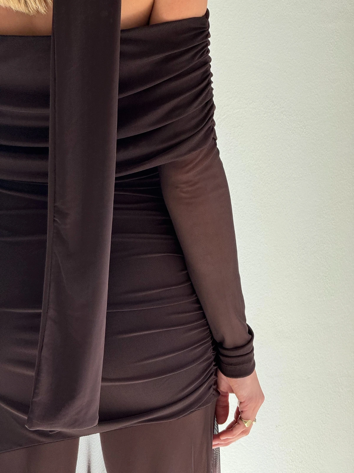 The Belle Maxi Dress by By Nicola is a sleek and modern take on evening wear. Crafted in a rich chocolate hue, this off-shoulder style features soft ruching through the bodice and sleeves, creating a flattering, structured silhouette.