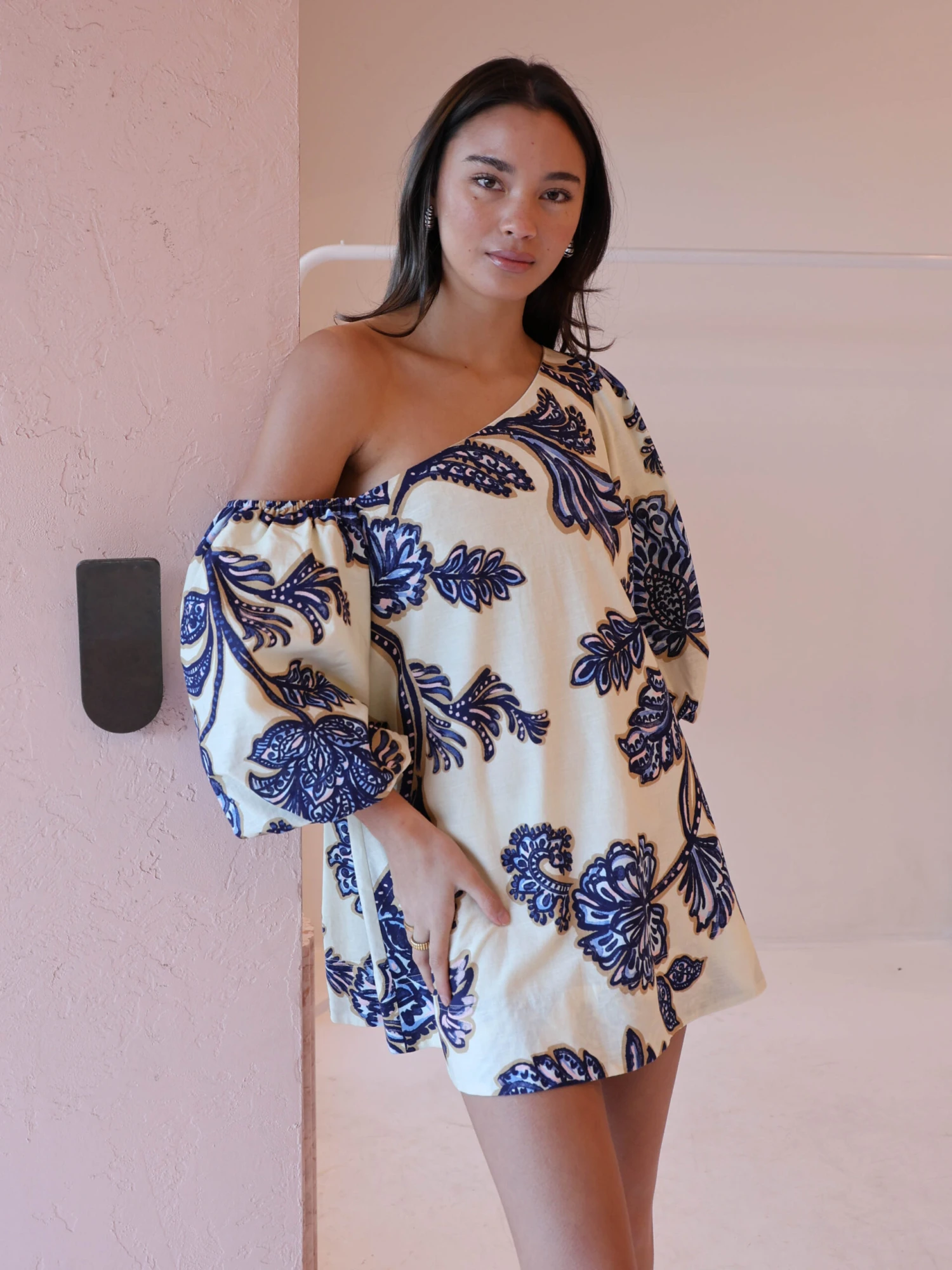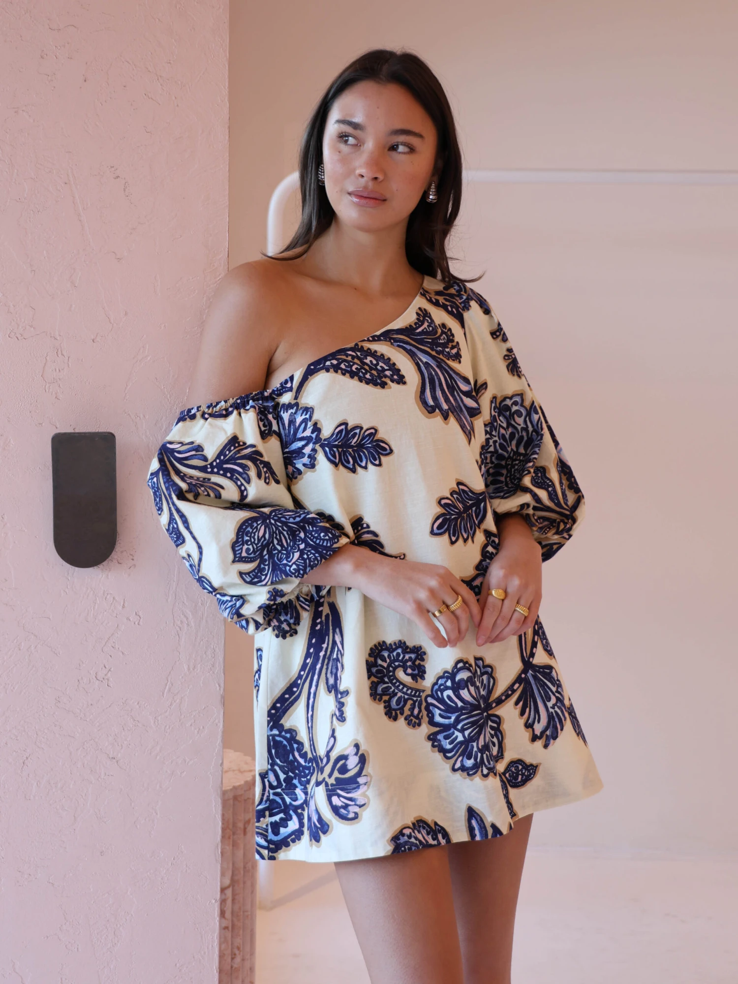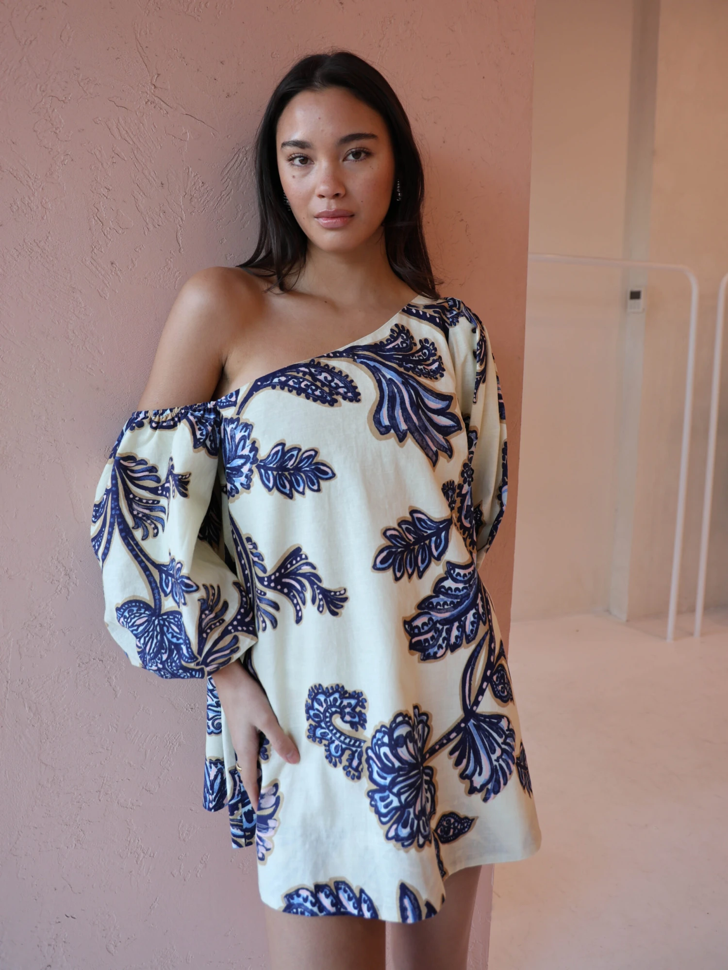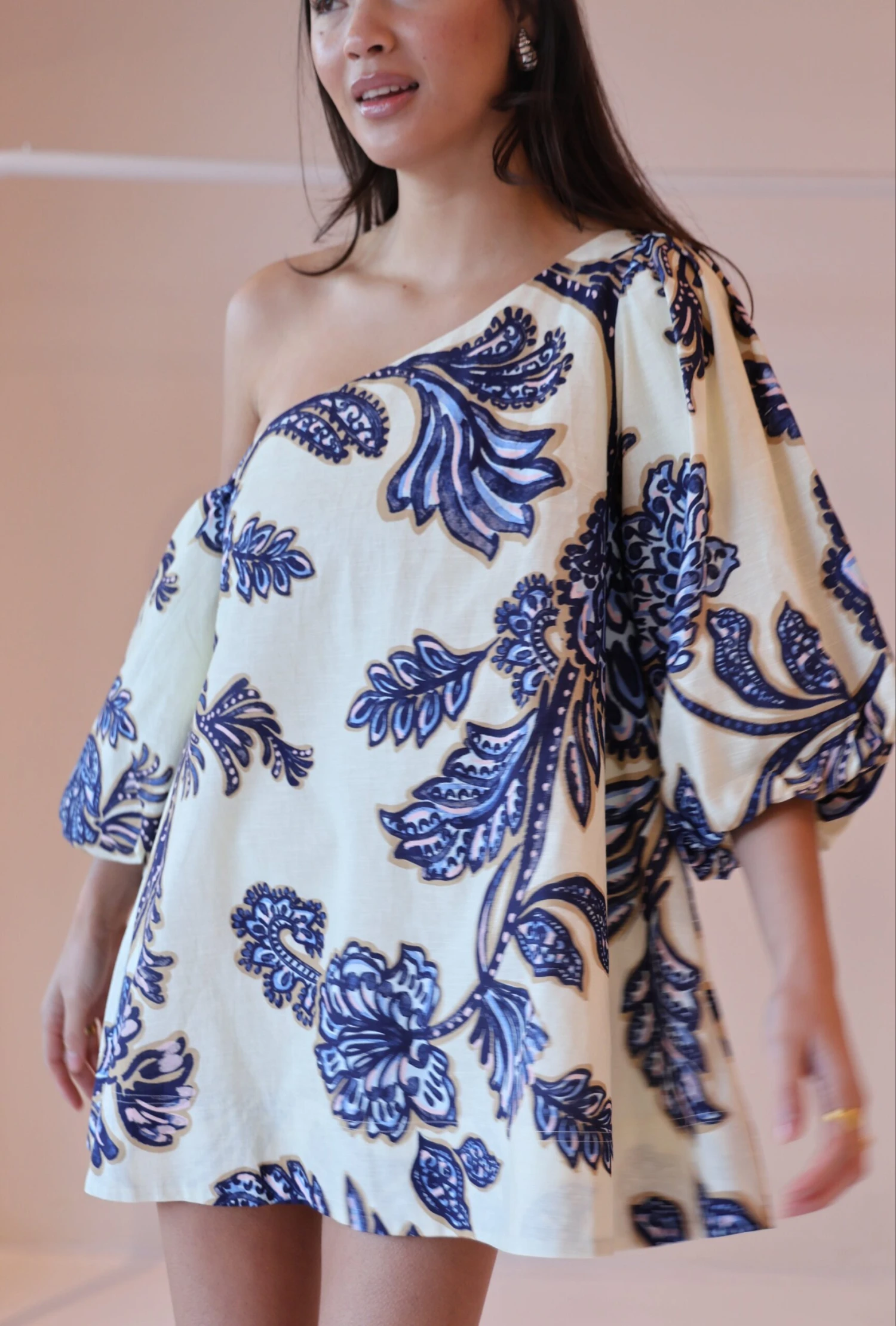 The Capri Mini in Blue Paisley is a light weight cotton linen blend designed to be a comfortable styling event dress. The Capri mini features an asymmetrical neckline with an off the shoulder sleeve for a relaxed look. The Capri is our staple mini style that is perfect for day events to evening dressed up with gold jewellery and heels.