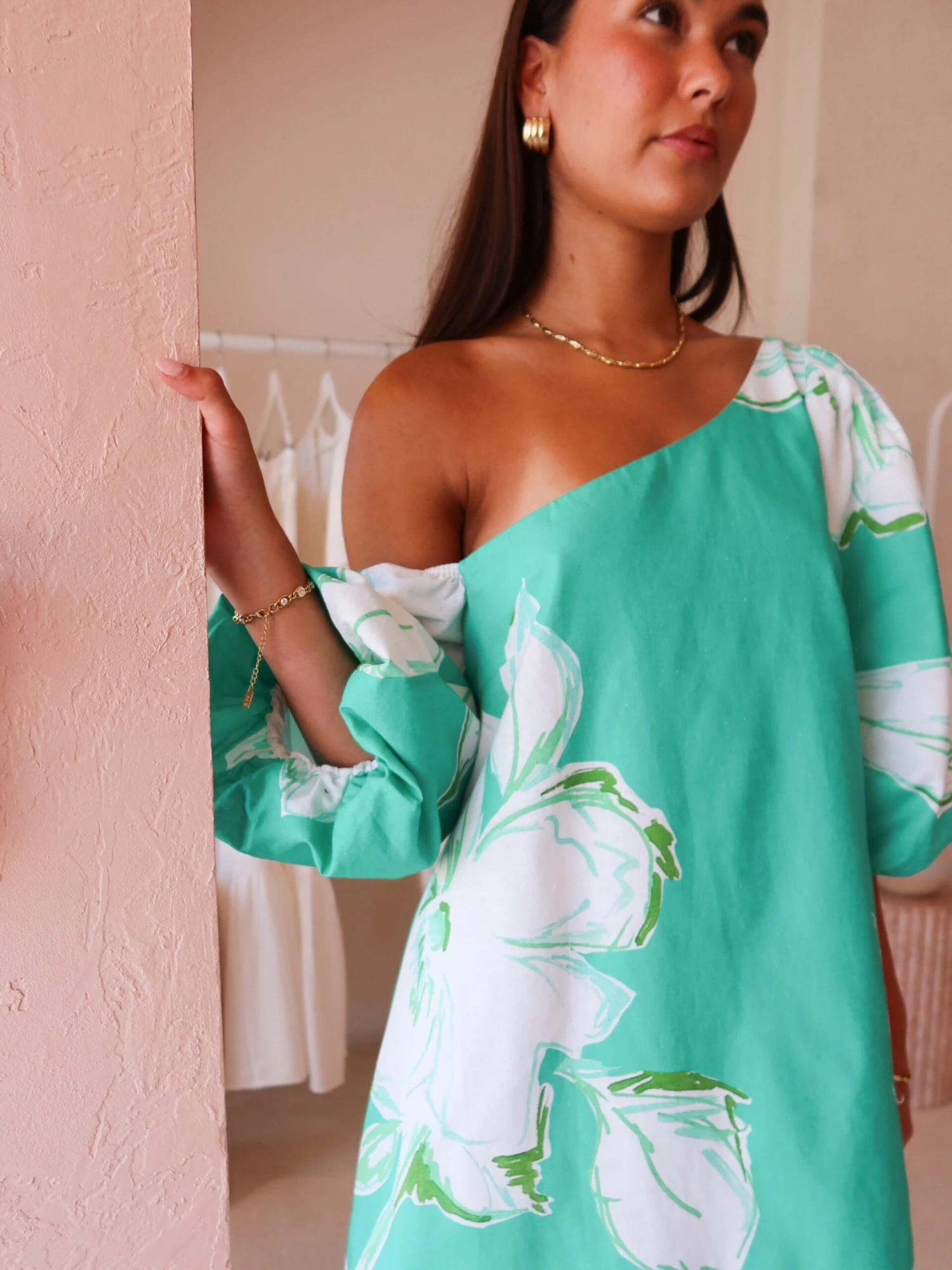 The Capri Off Shoulder Relaxed Mini Dress in Verde Fleur is a new exclusive to Coco & Lola. The off the shoulder relaxed fit accentuates the neckline.
