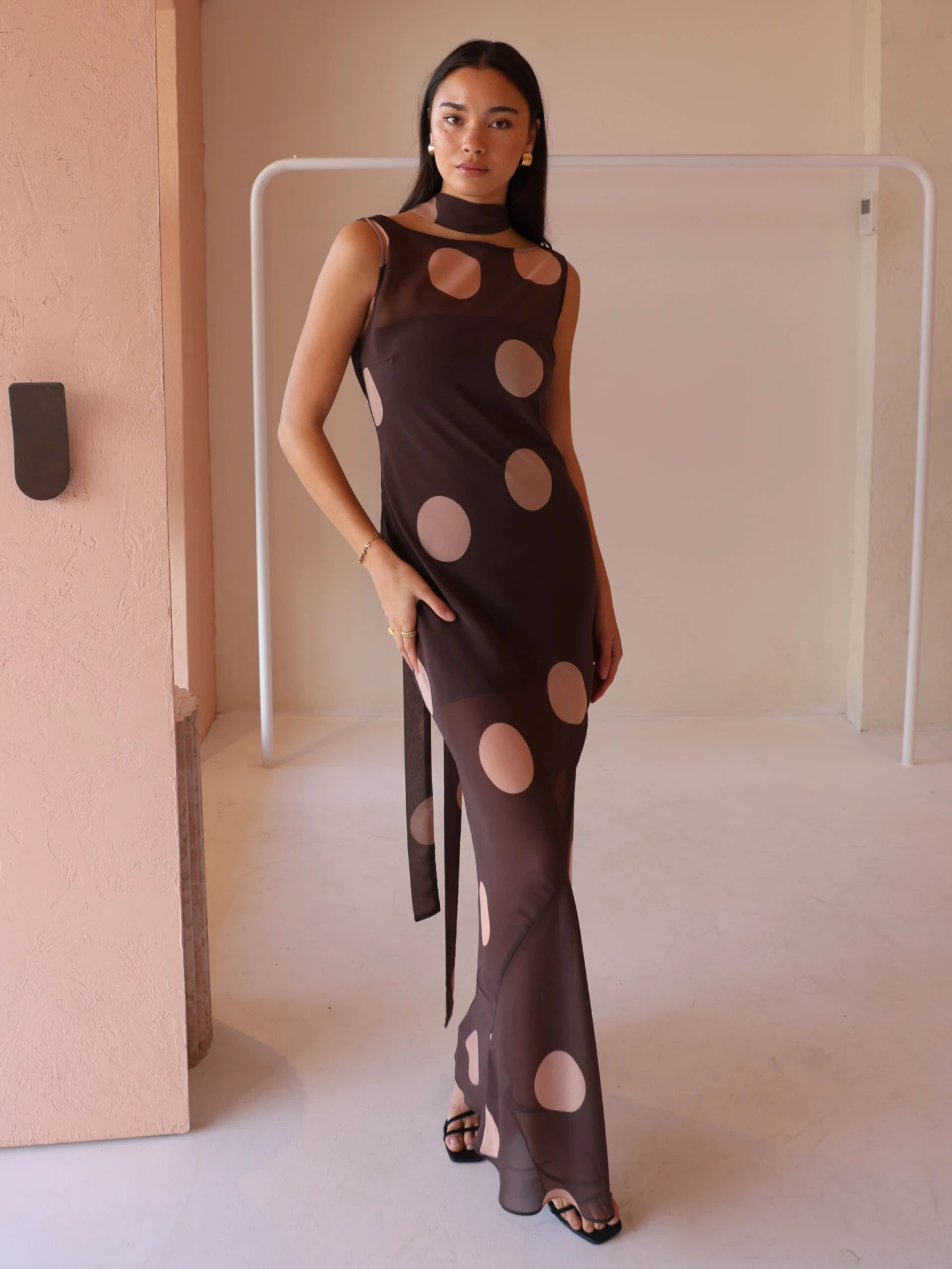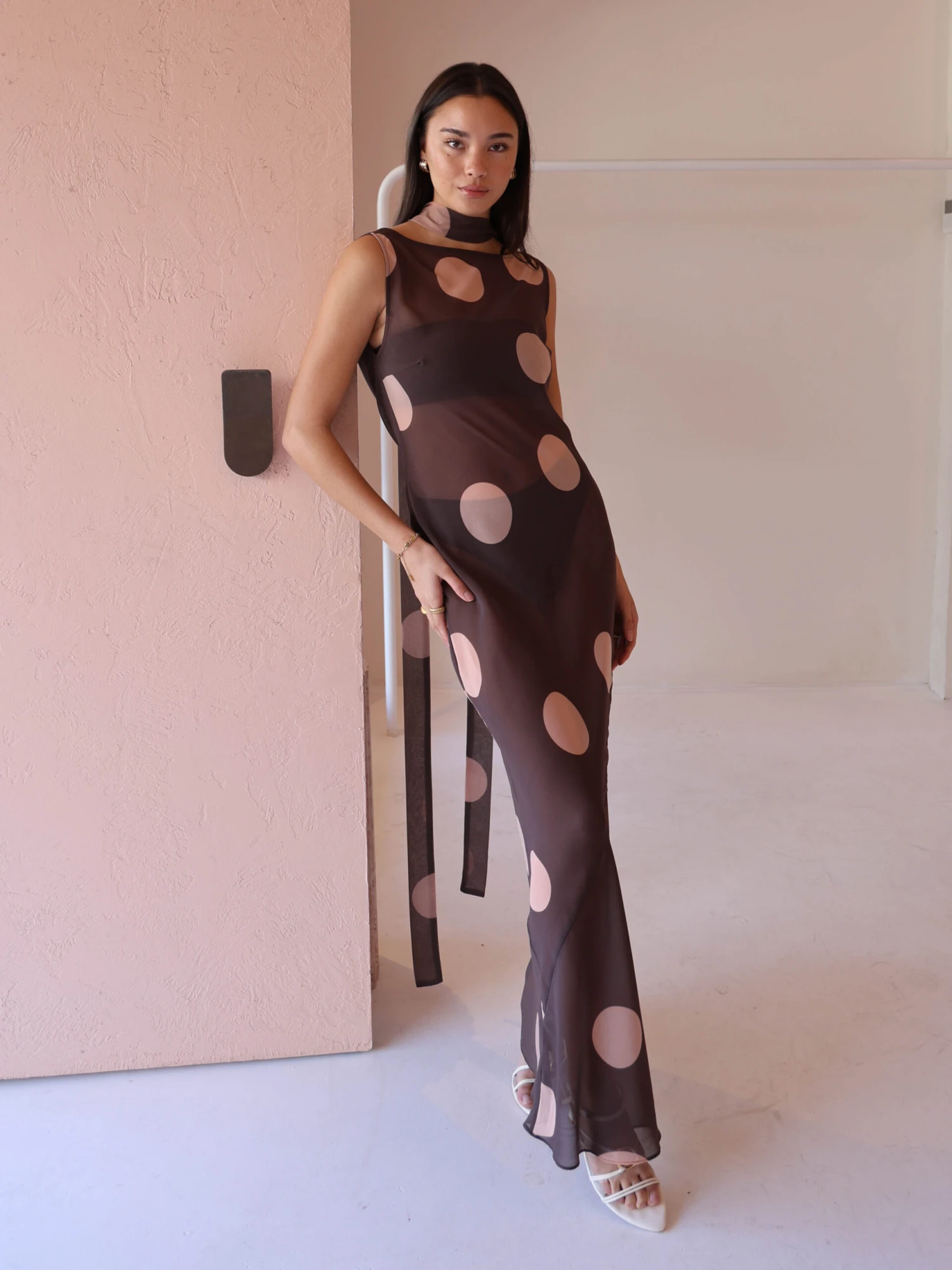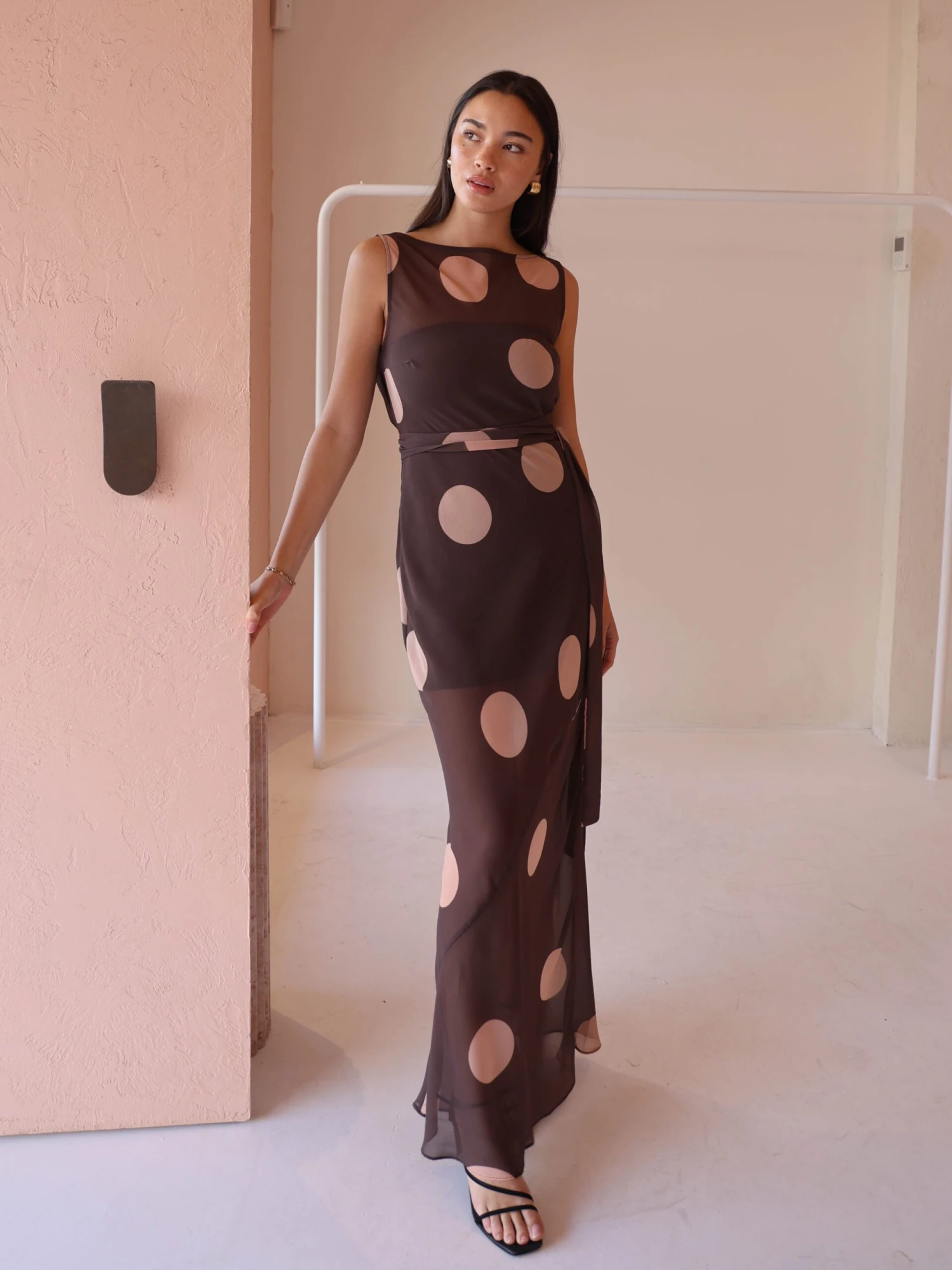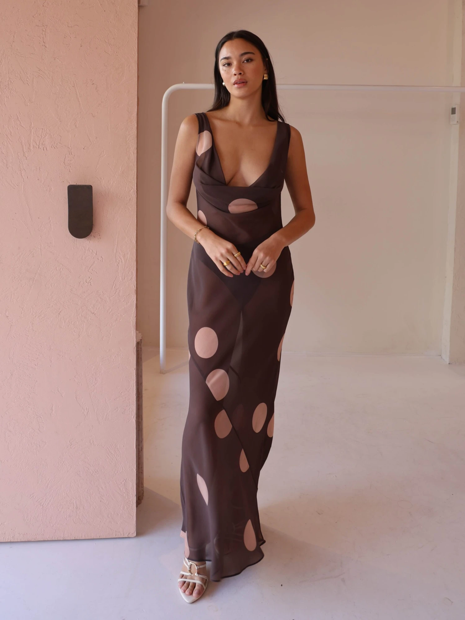 The Juno Maxi Dress in Chocolate Polka is made from a soft chiffon cut on the bias that skims over the body.