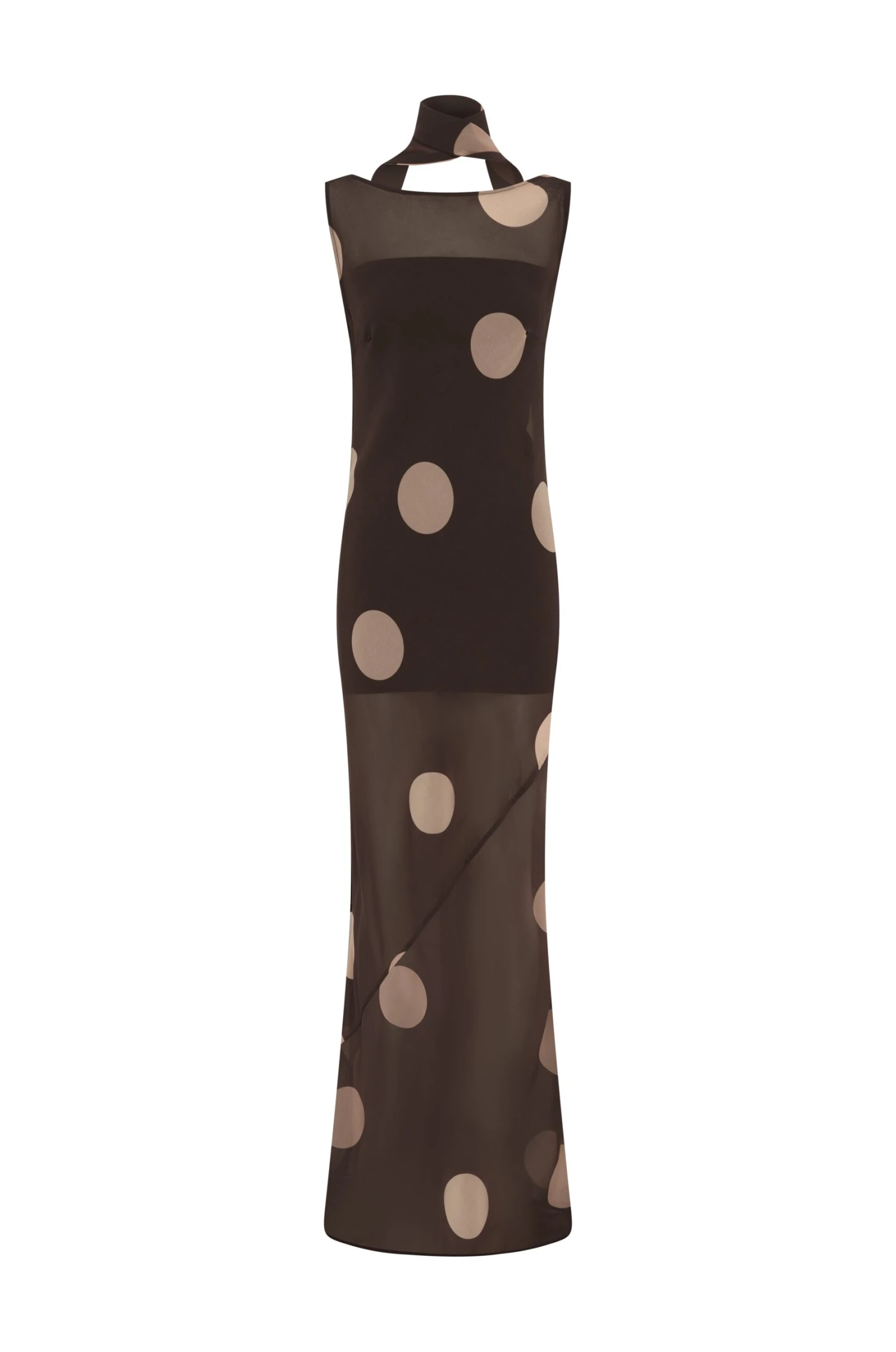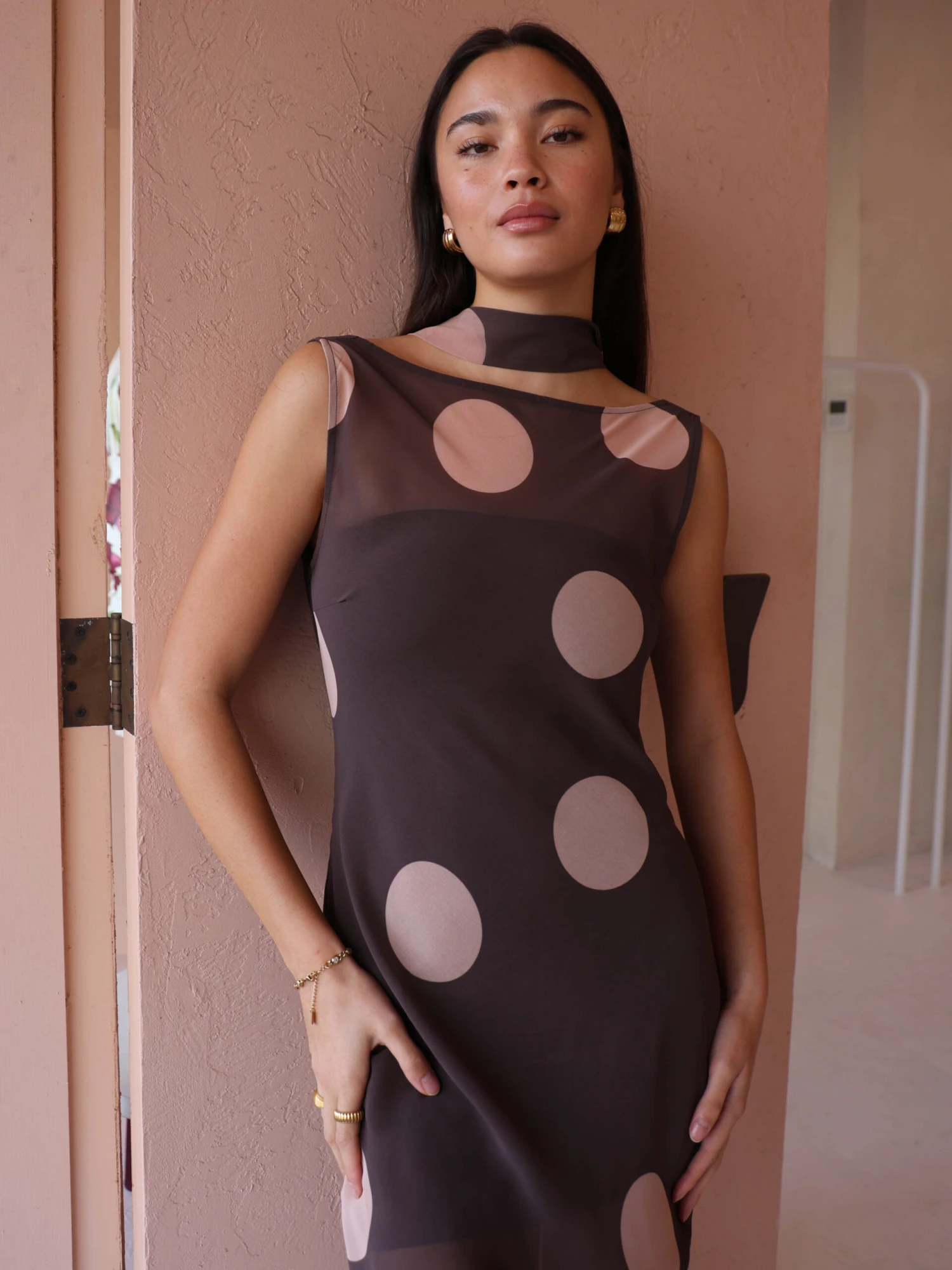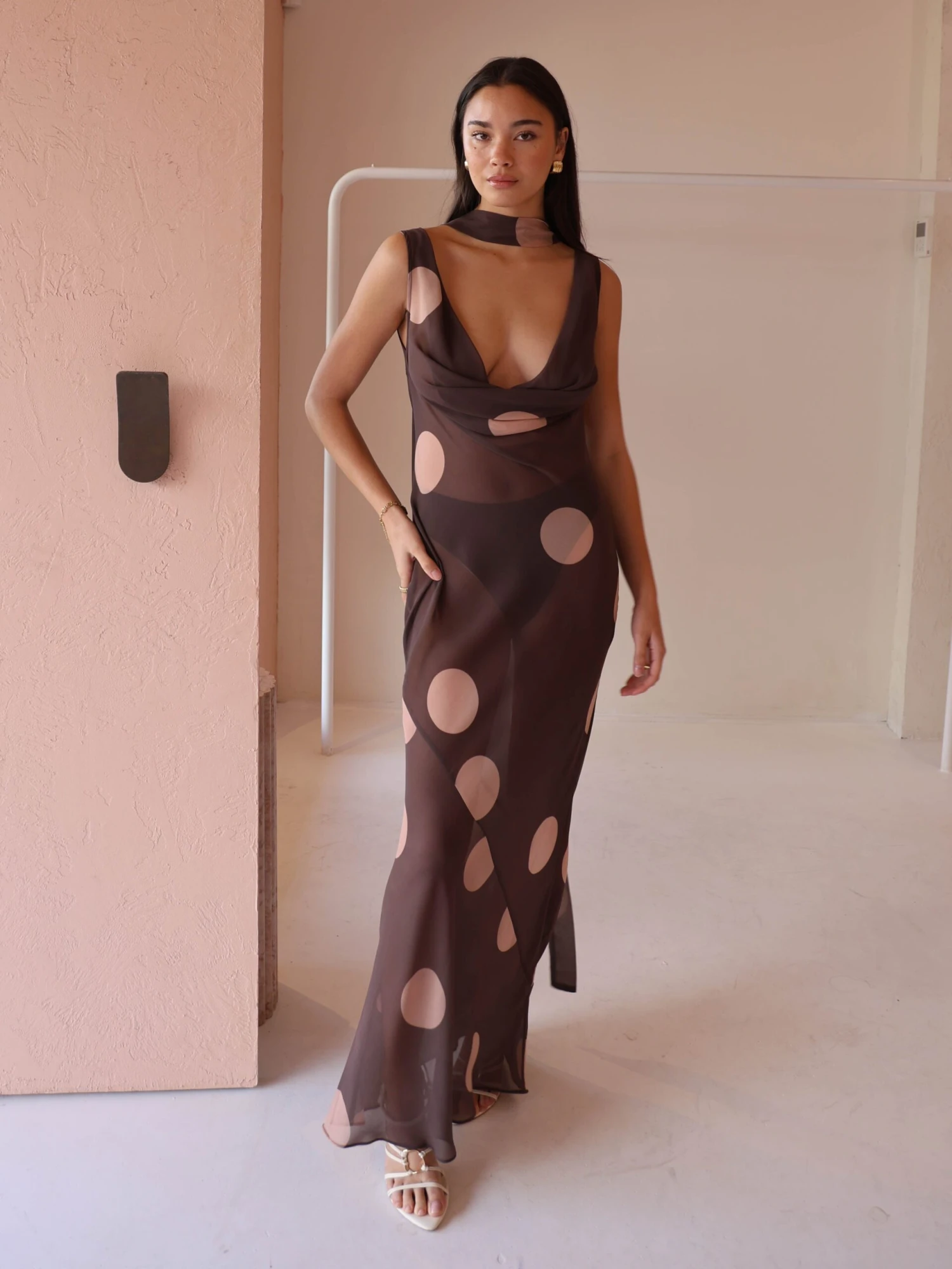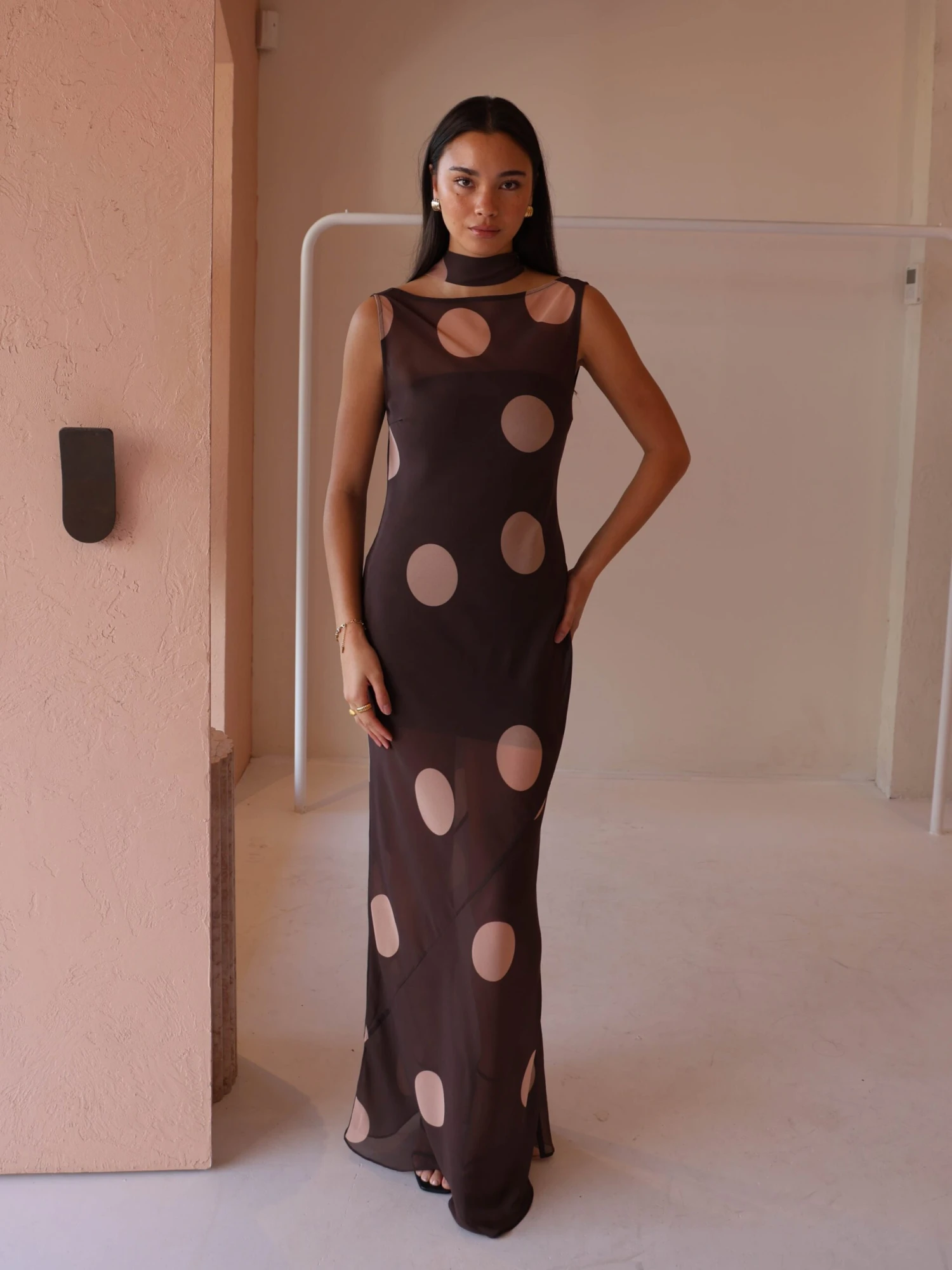 The Juno Maxi Dress in Chocolate Polka is made from a soft chiffon cut on the bias that skims over the body.