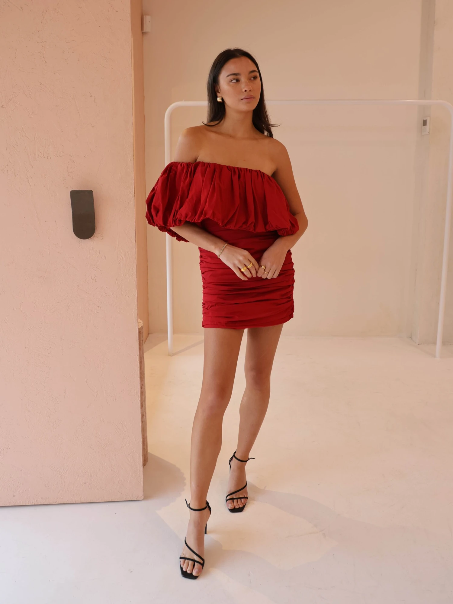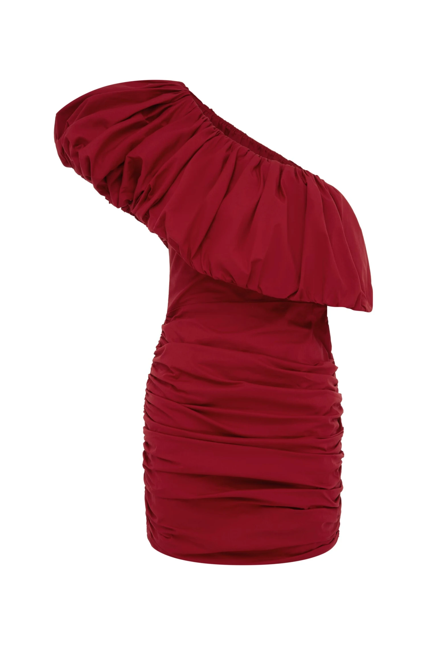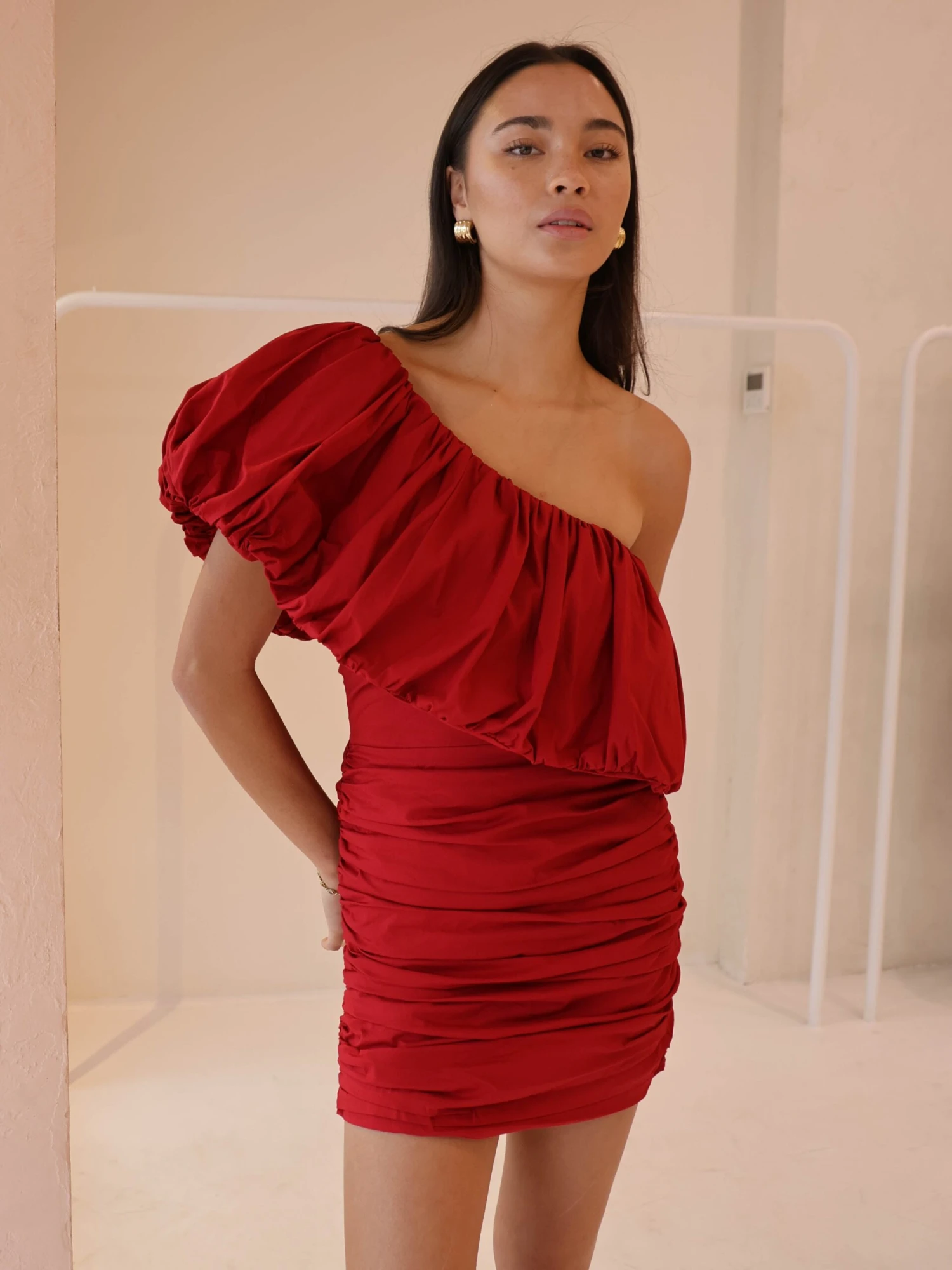 The Maya Mini Dress in Rouge offers a bold take on classic party dressing. Cut in a striking red hue, it features a one-shoulder neckline with a gathered ruffle that can be style both on and off the shoulder.