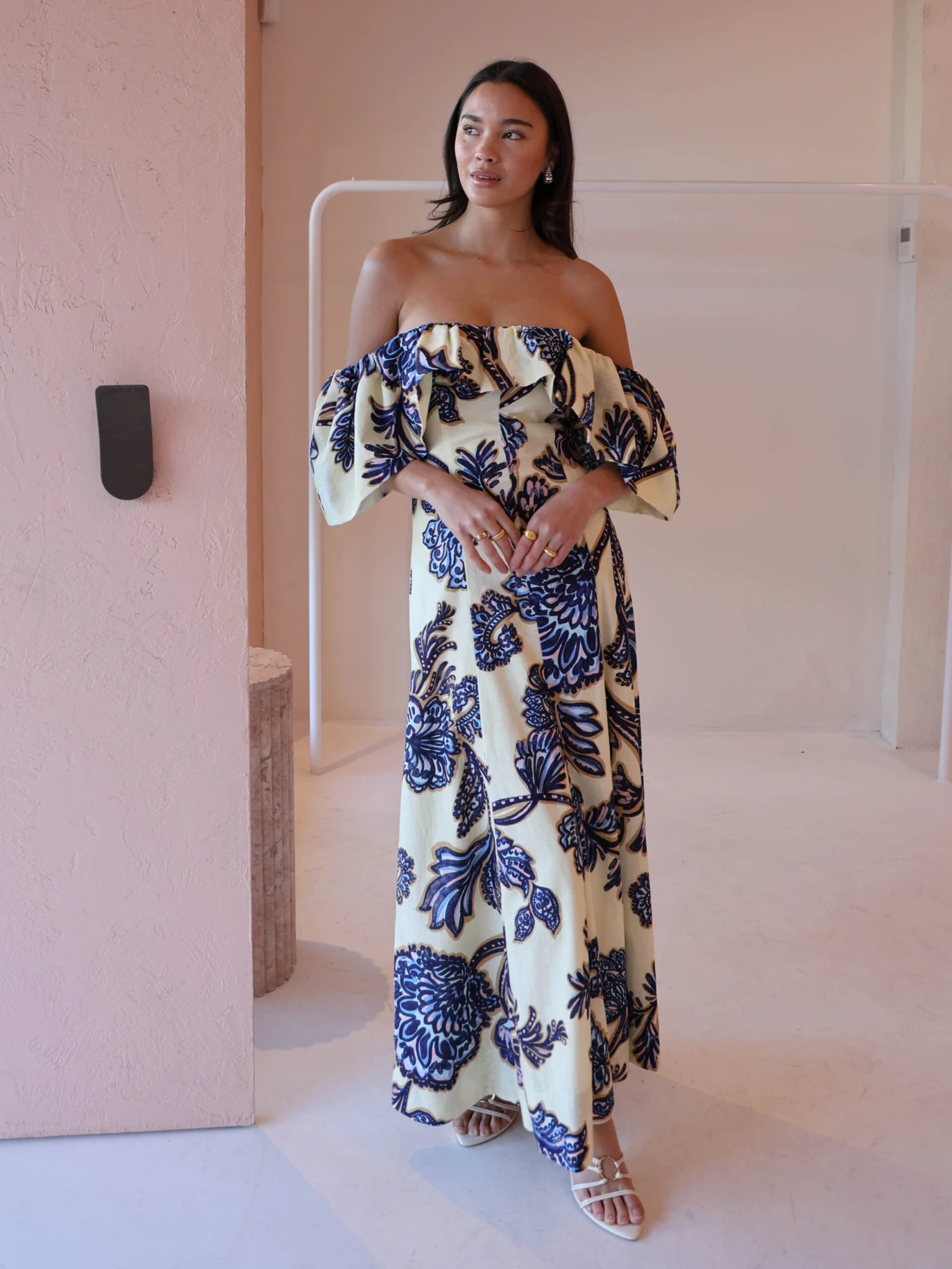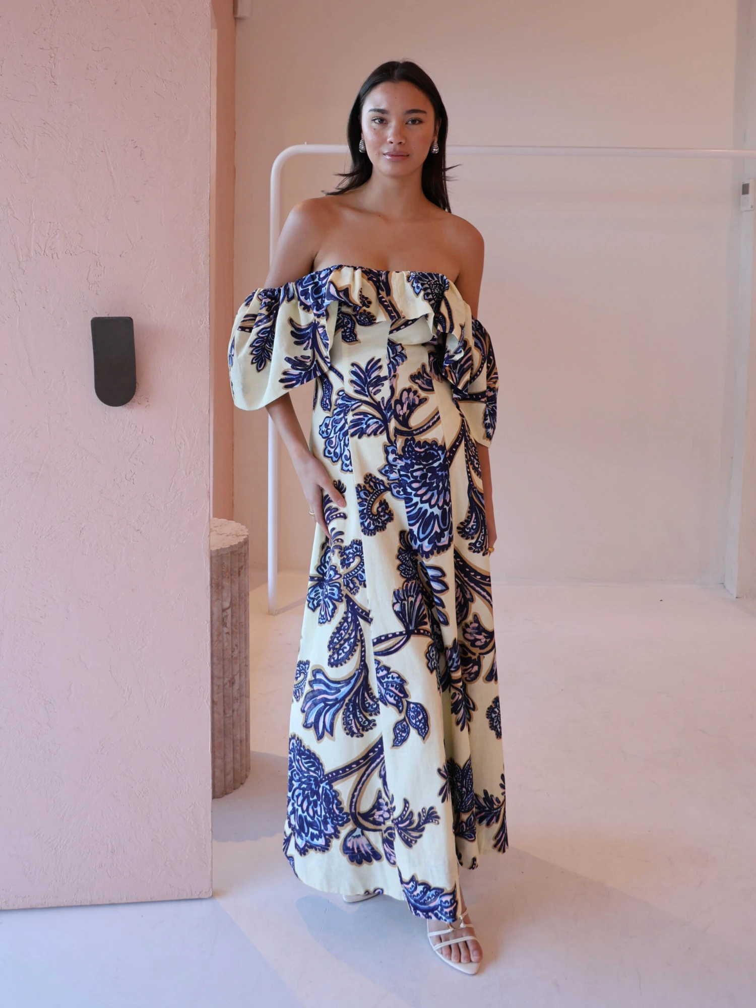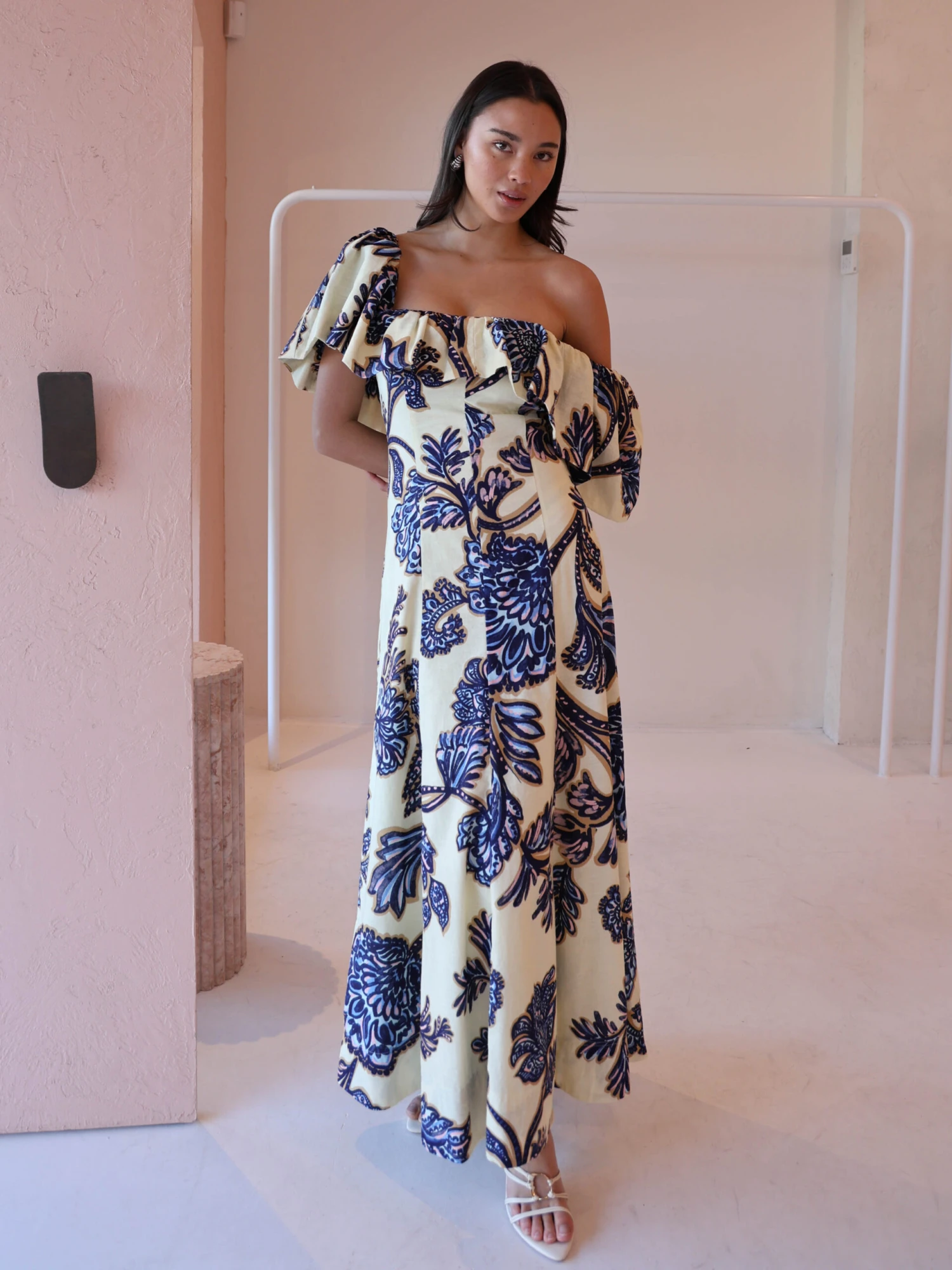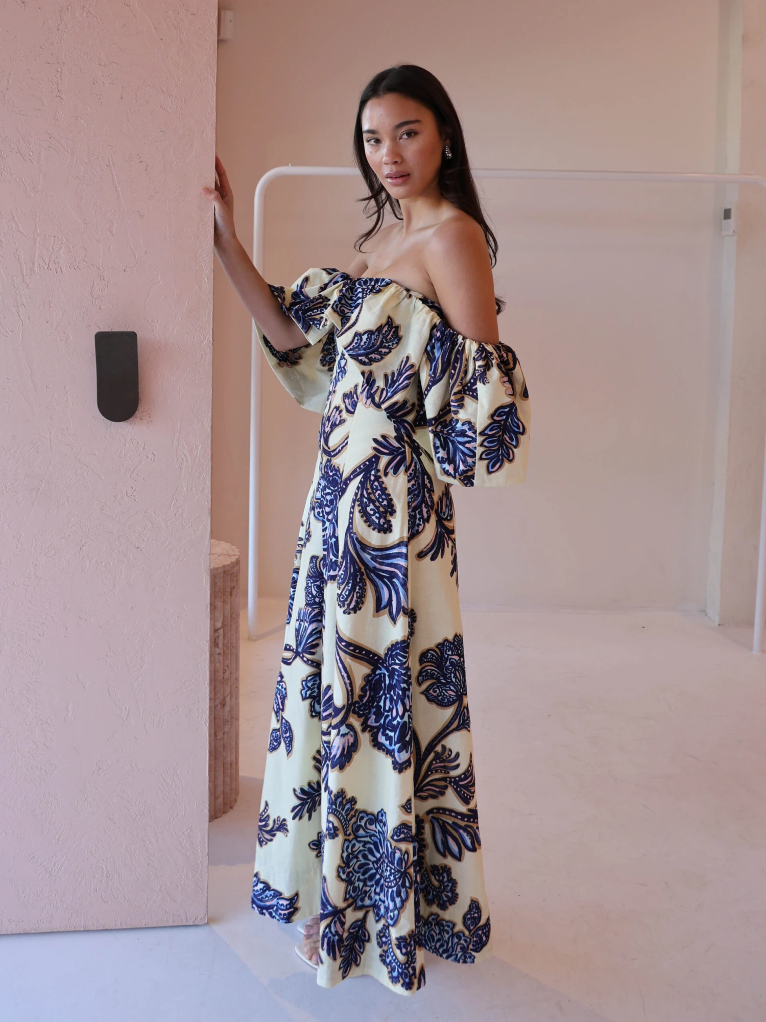 Step back into our Paradiso Maxi Dress in Blue Paisley. This style is cut from a soft cotton linen blend. Featuring panel detailing this style is fitted through the waist. The Paradiso can be styled 3 different ways. Off shoulder, one sleeve above shoulder or both sleeves on the shoulder.