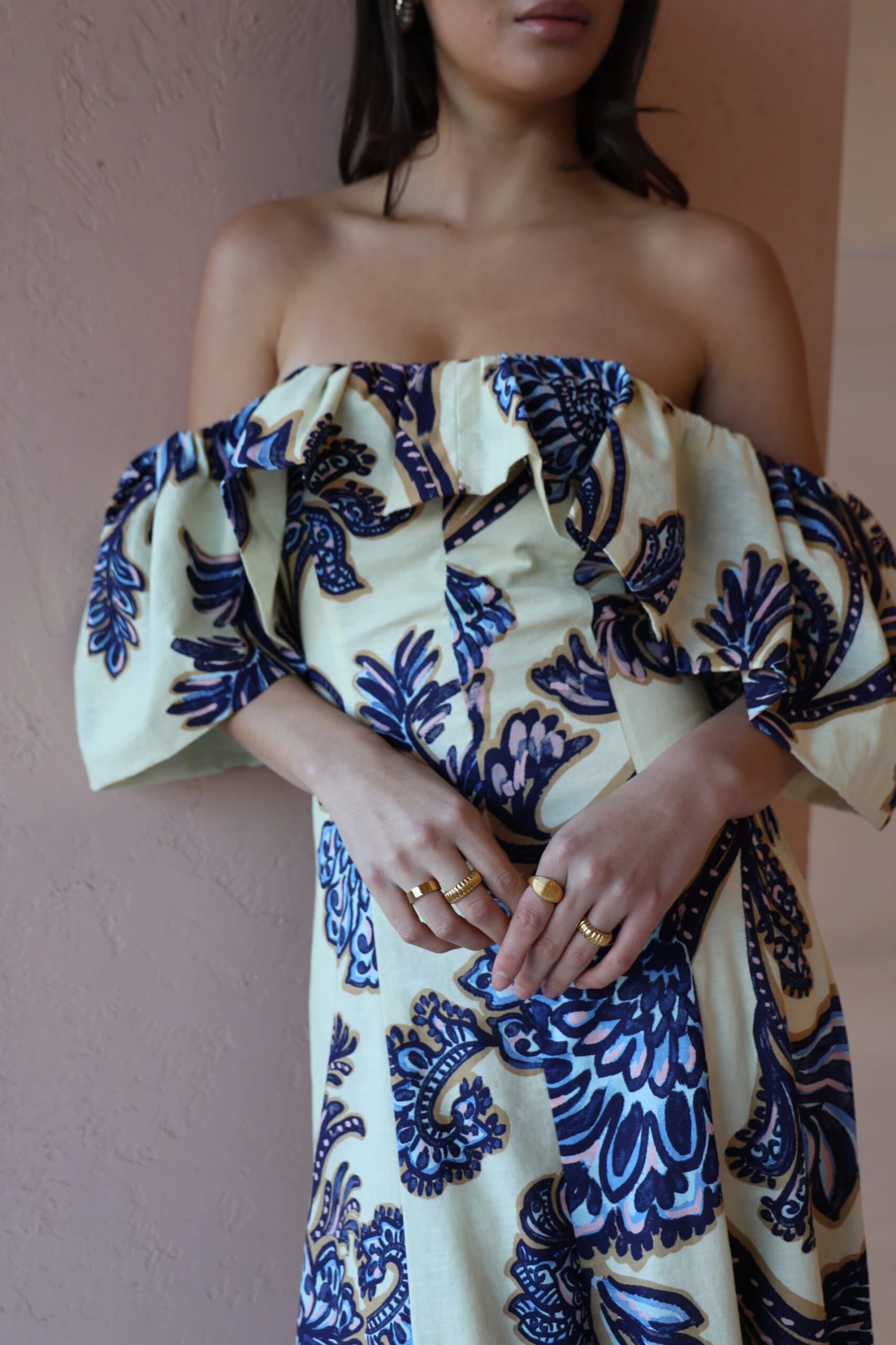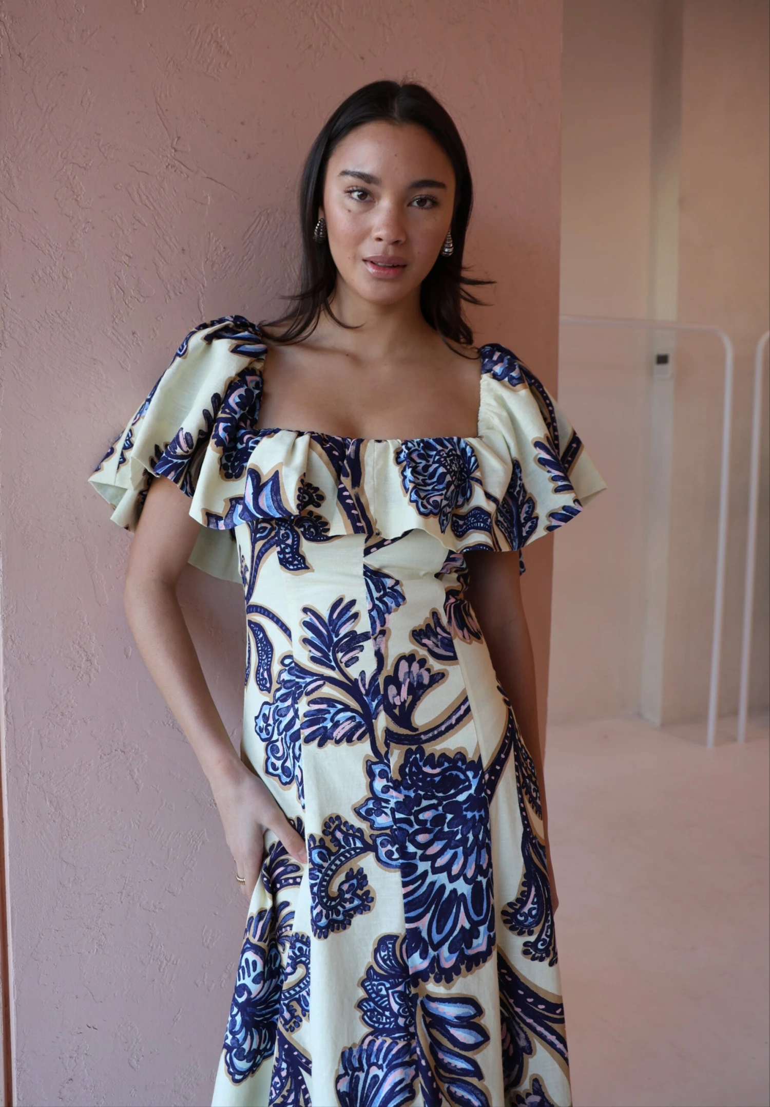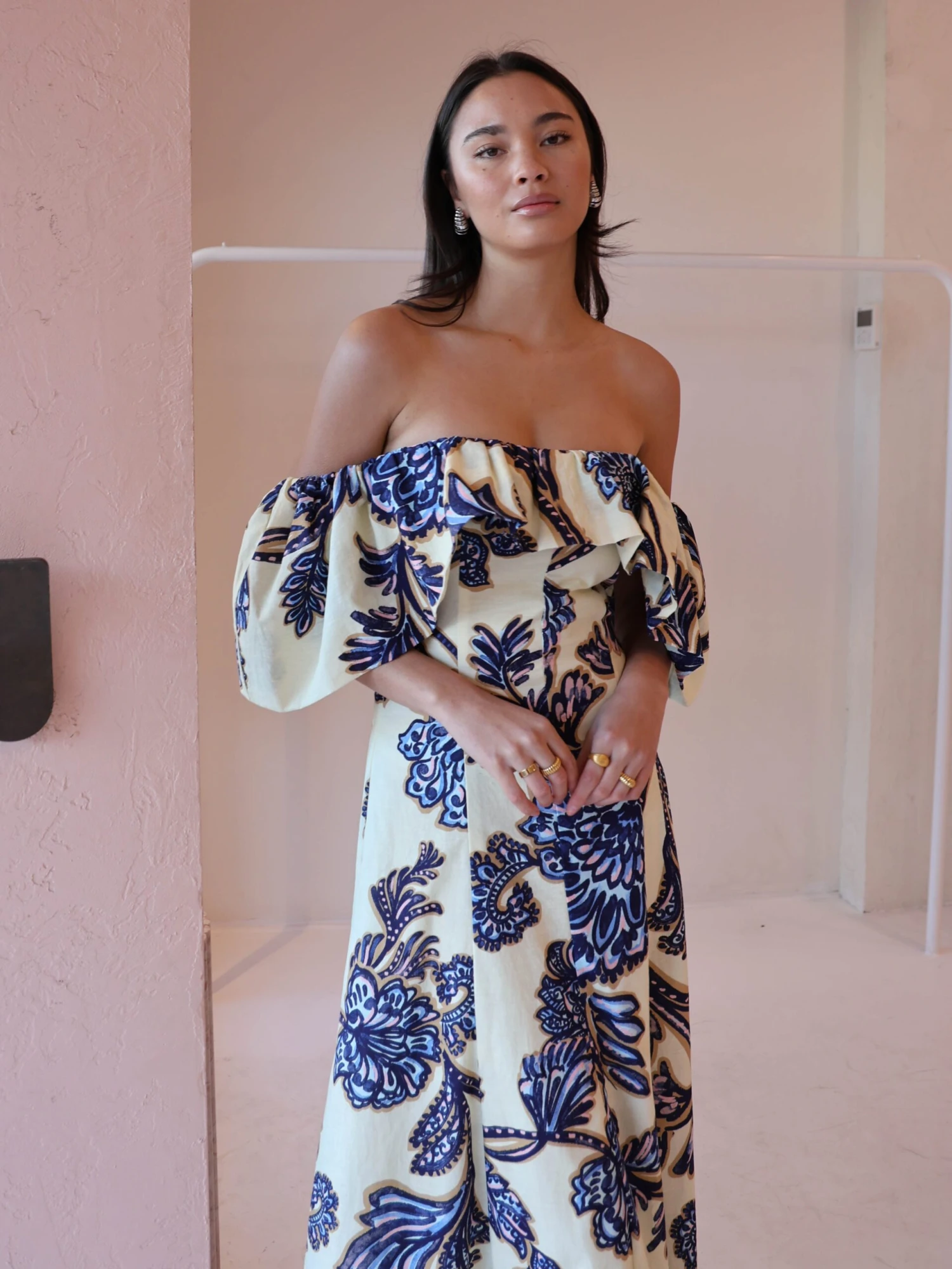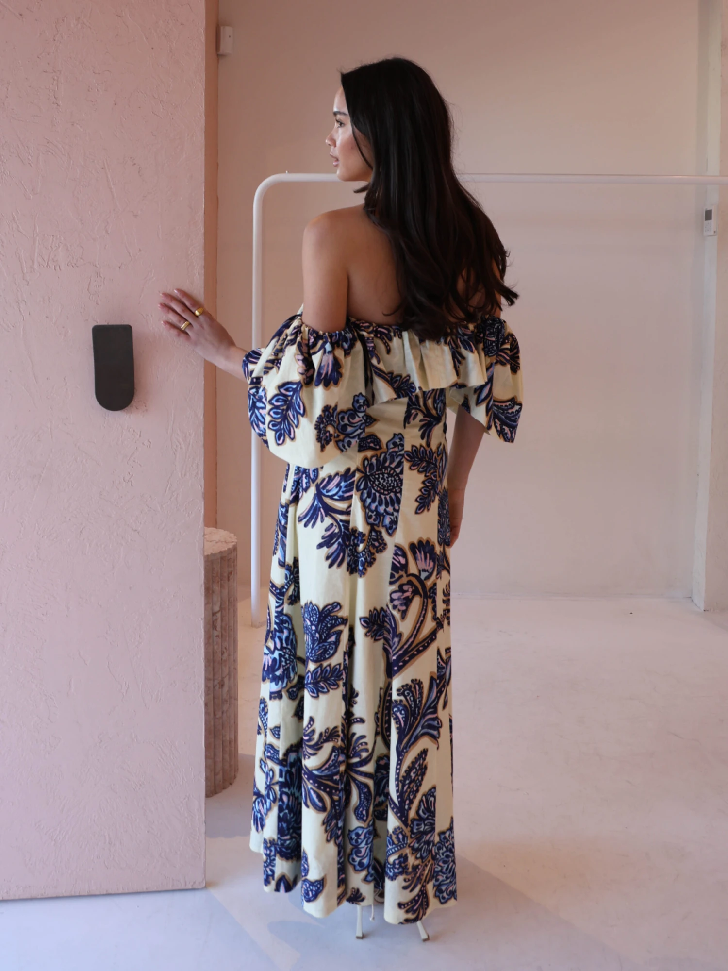 Step back into our Paradiso Maxi Dress in Blue Paisley. This style is cut from a soft cotton linen blend. Featuring panel detailing this style is fitted through the waist. The Paradiso can be styled 3 different ways. Off shoulder, one sleeve above shoulder or both sleeves on the shoulder.