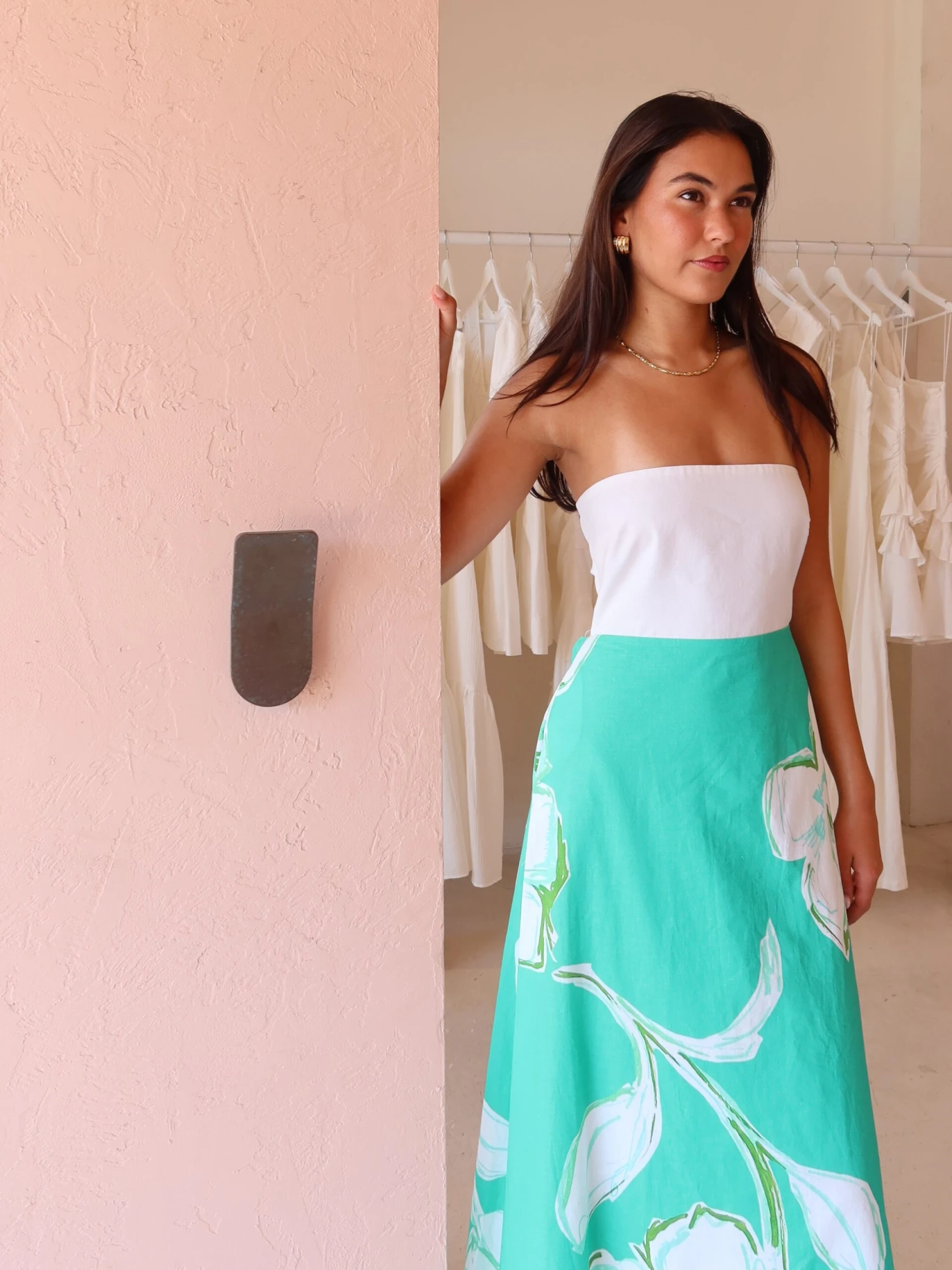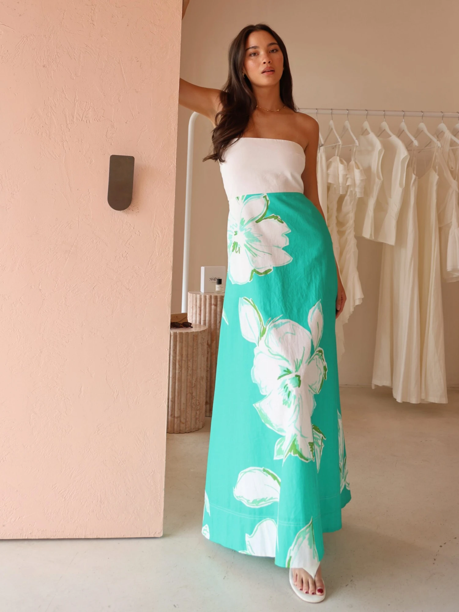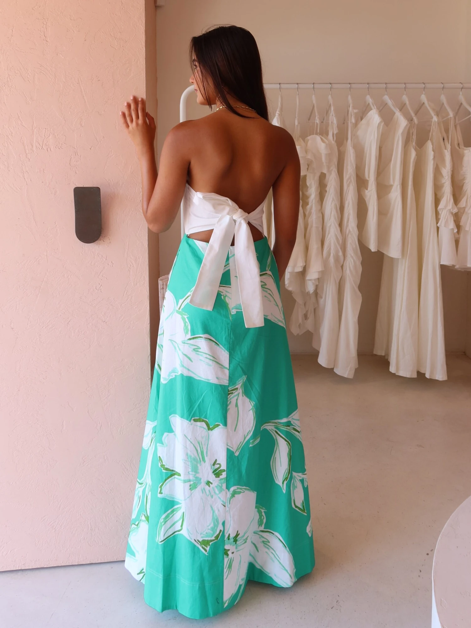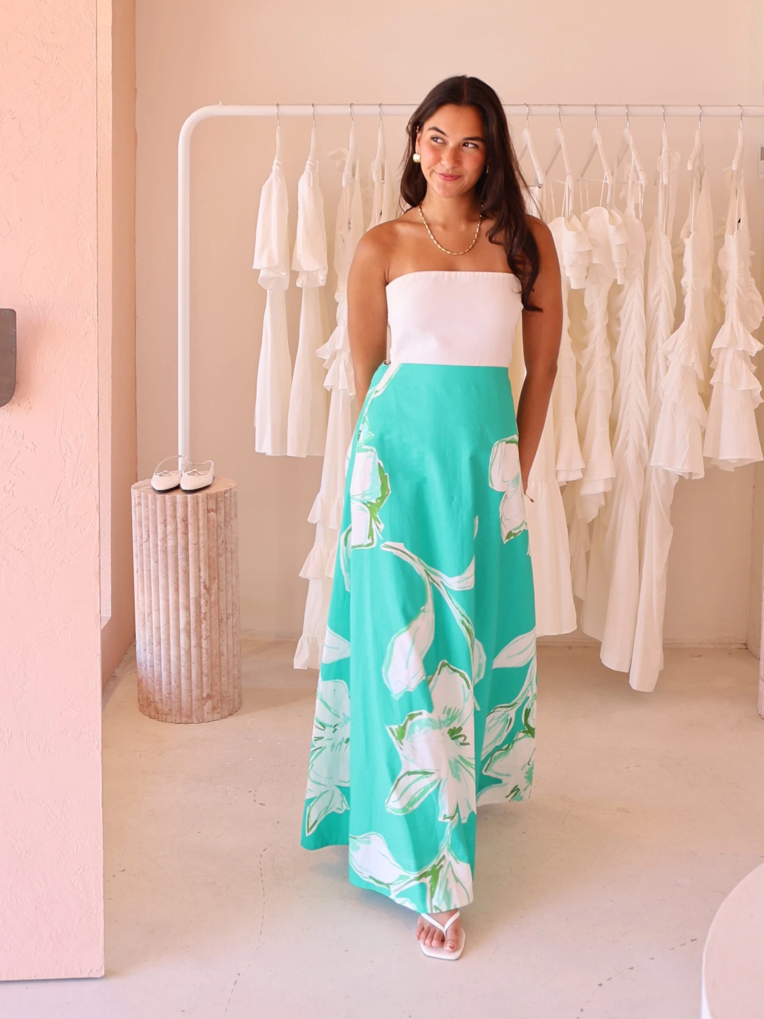 The strapless white bodice created this piece to be easily styled with gold jewellery and compliments the white flowers throughout the dress.