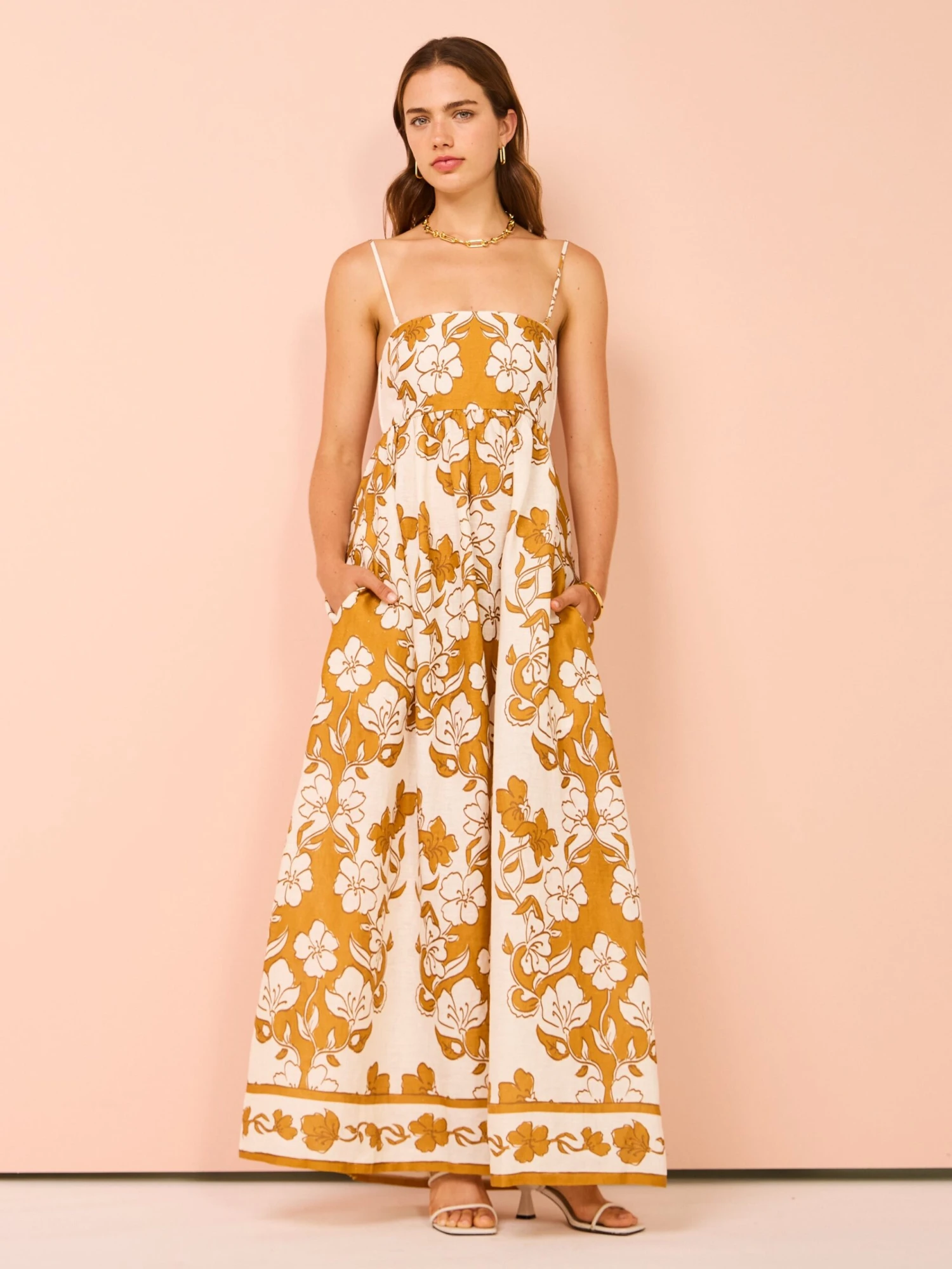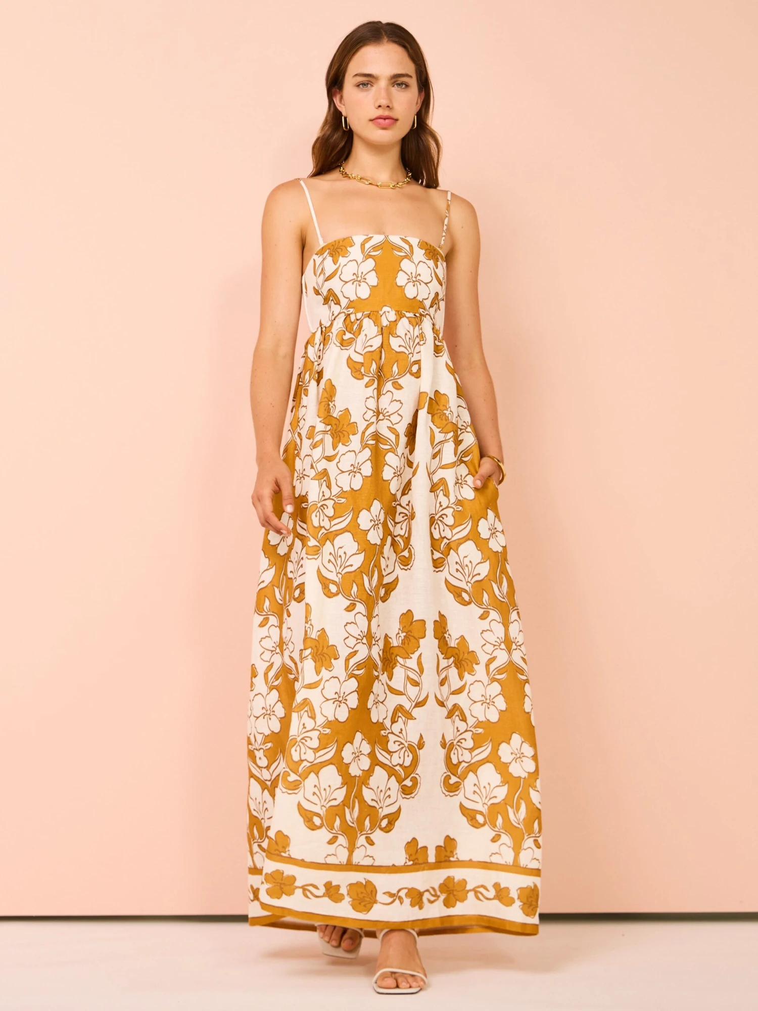 Crafted from a luxurious linen, this maxi dress features a strapless neckline with gel tape and removable straps before floating to an effortless maxi skirts with inseam pockets.