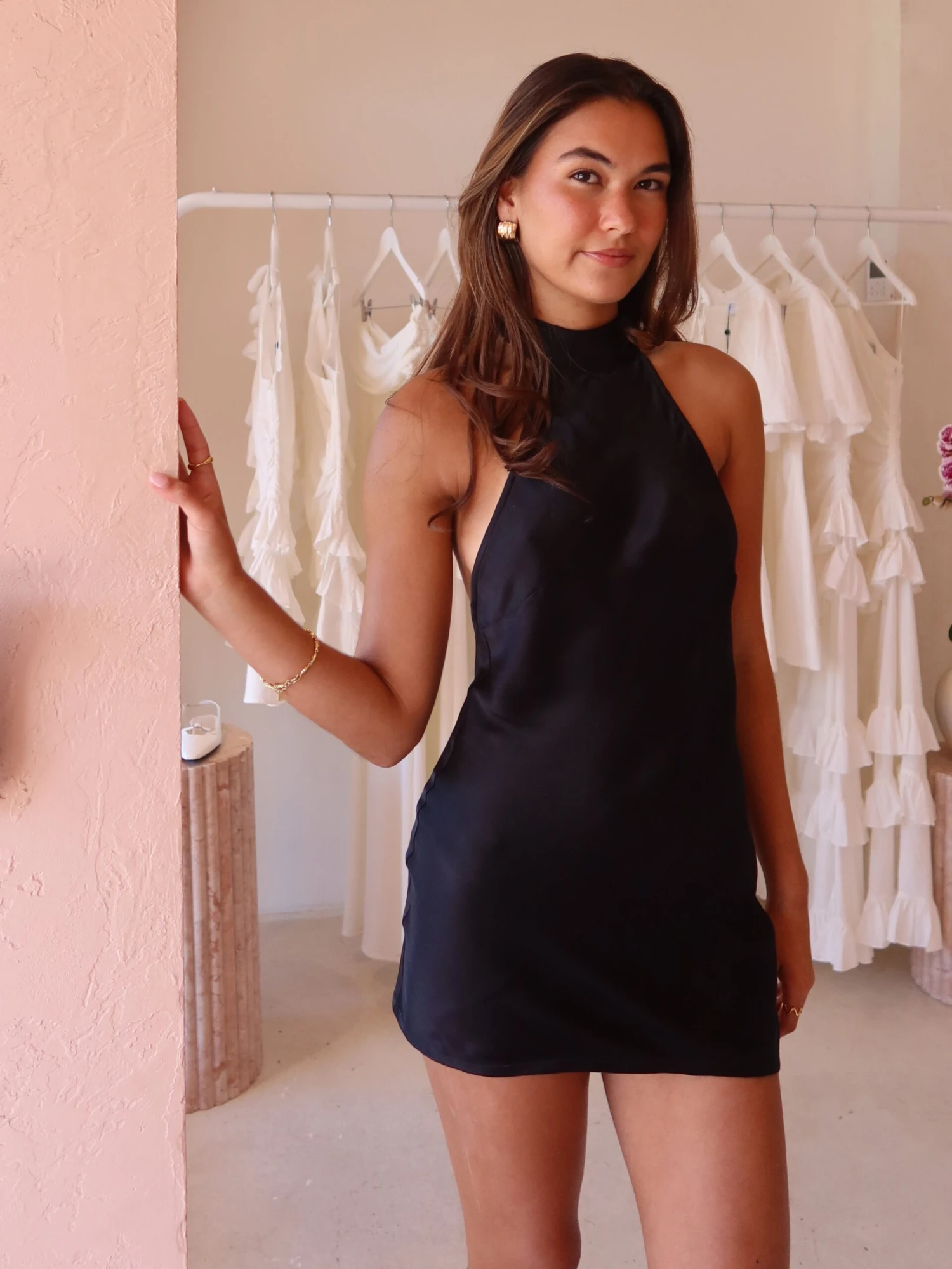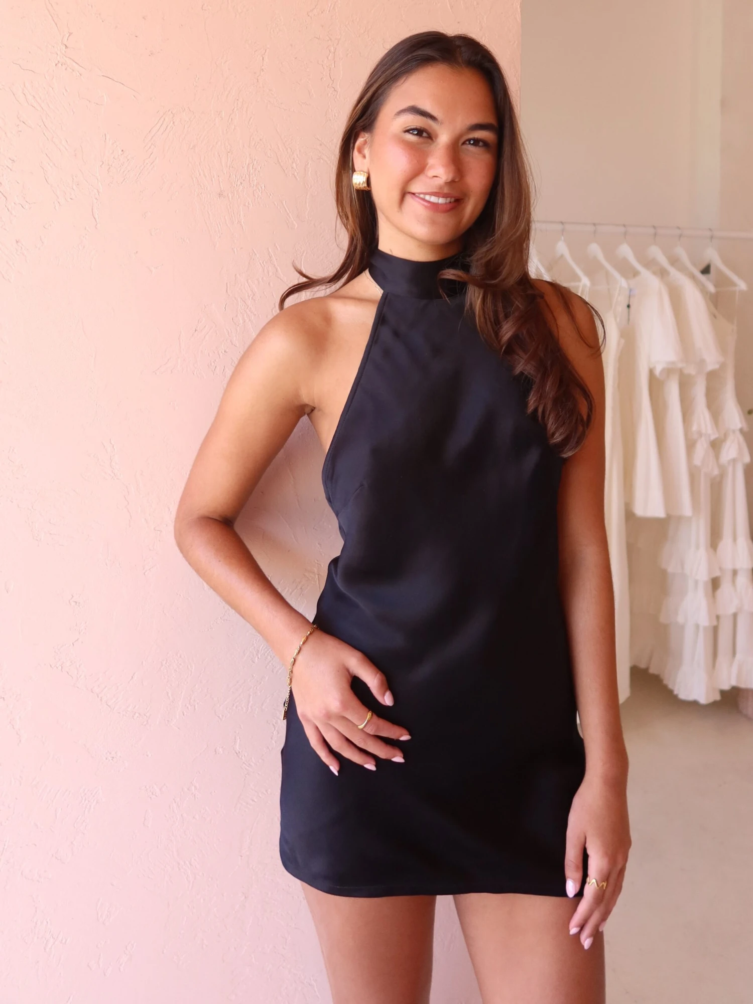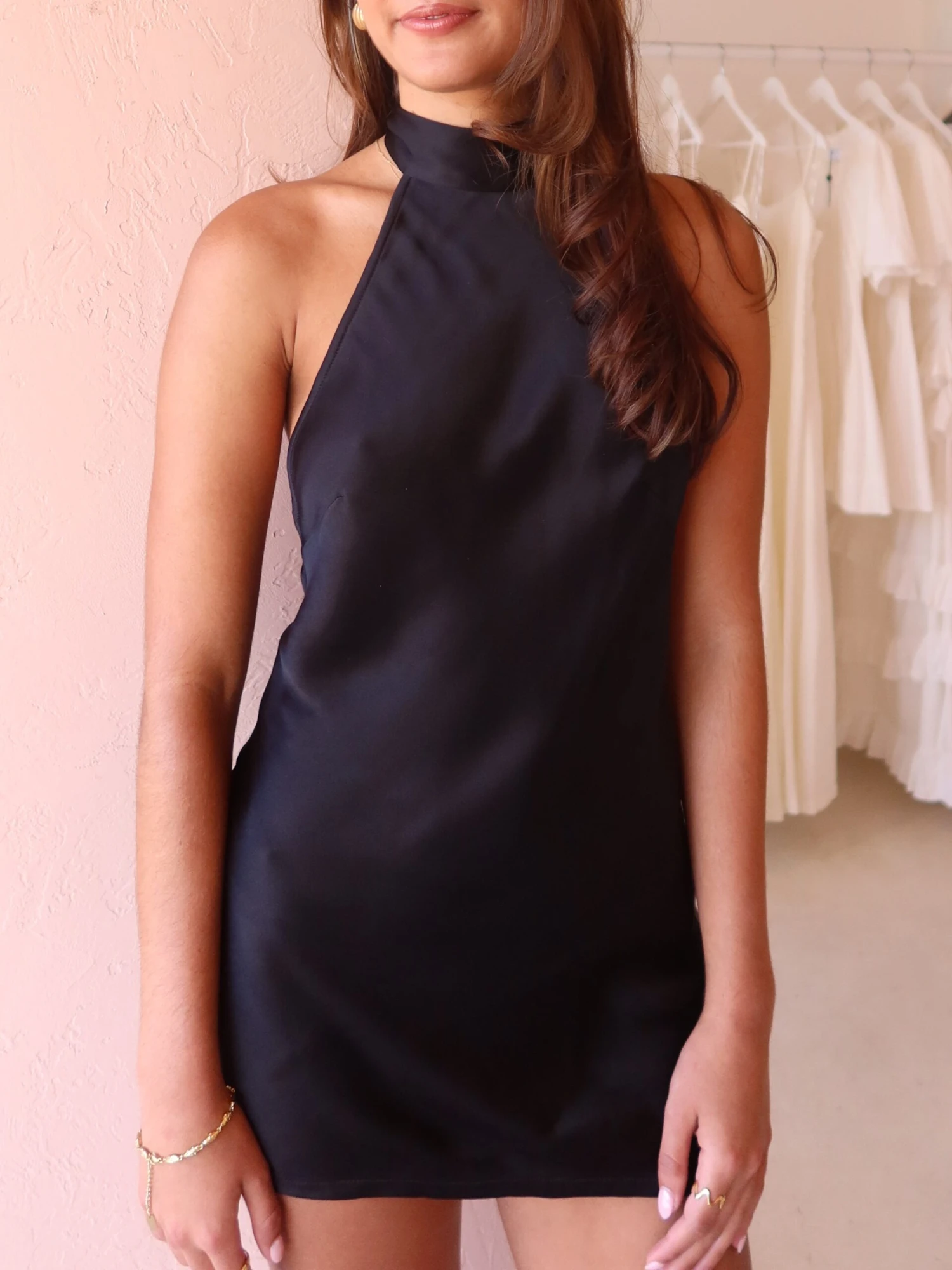 The flirty halter neck mini dress adds an element of fun to your wardrobe with elongated necktie and deep open back perfect for summer day events leading you into your evening.