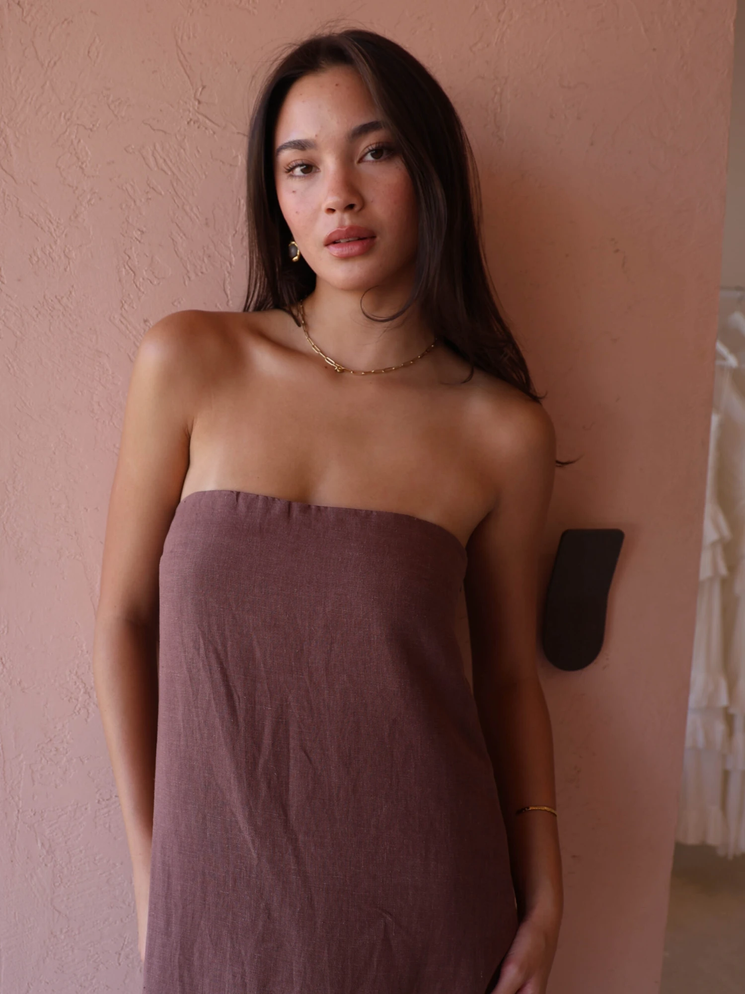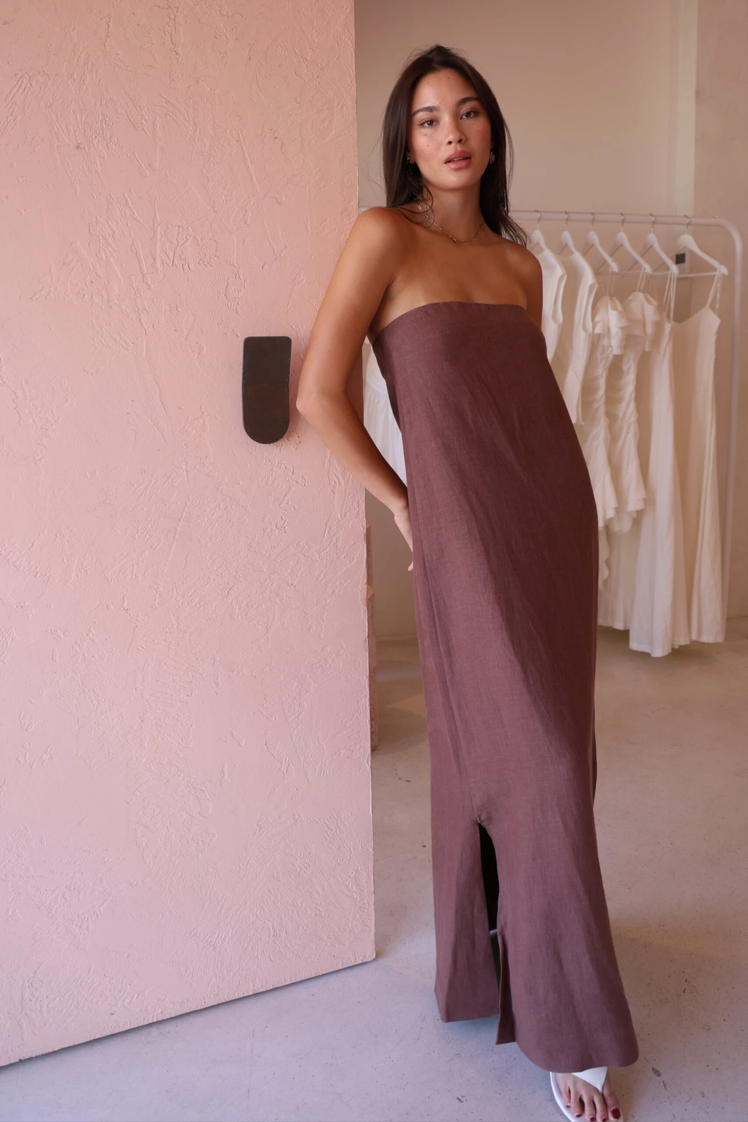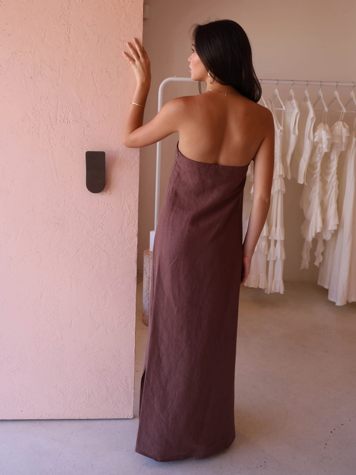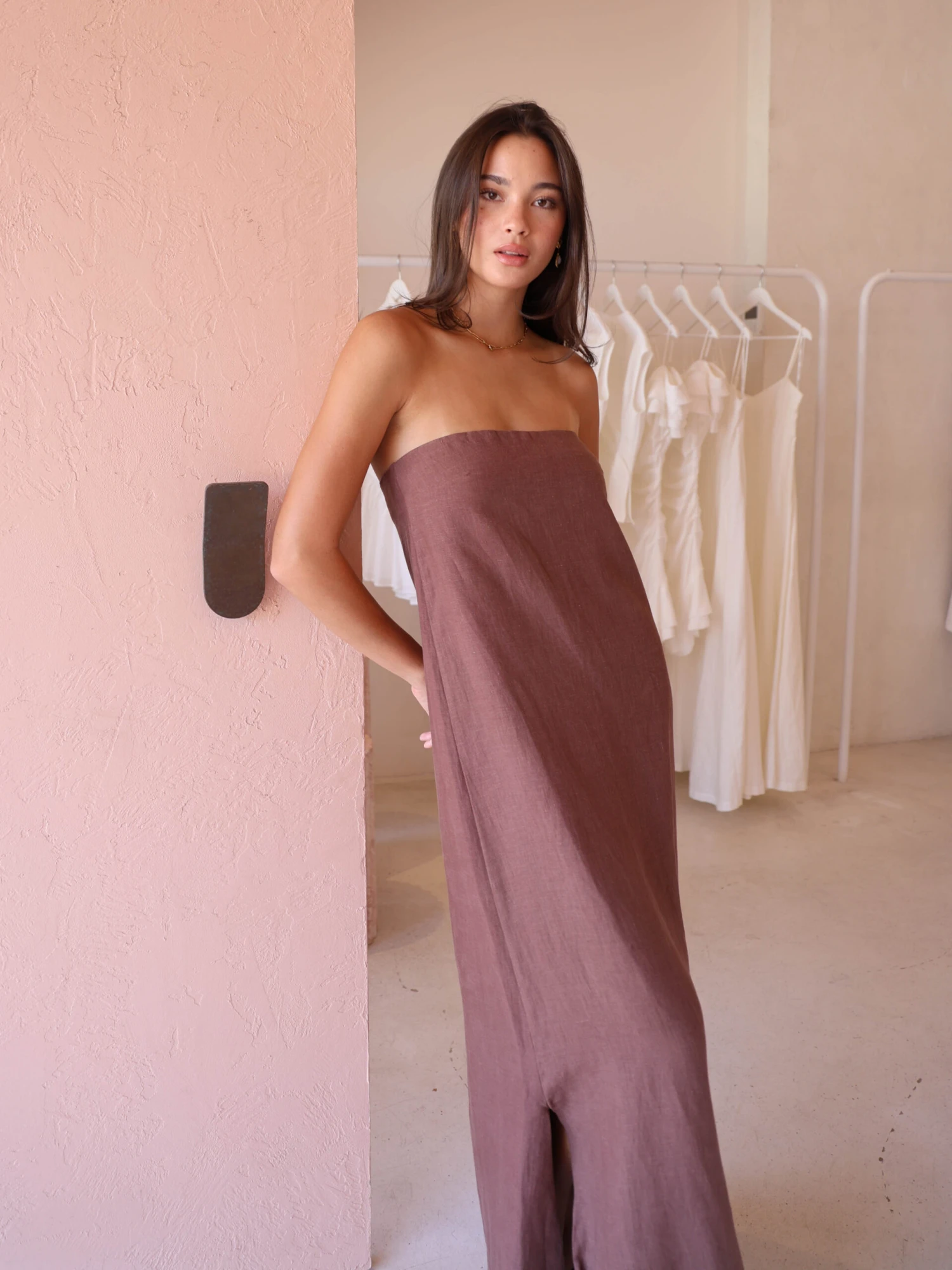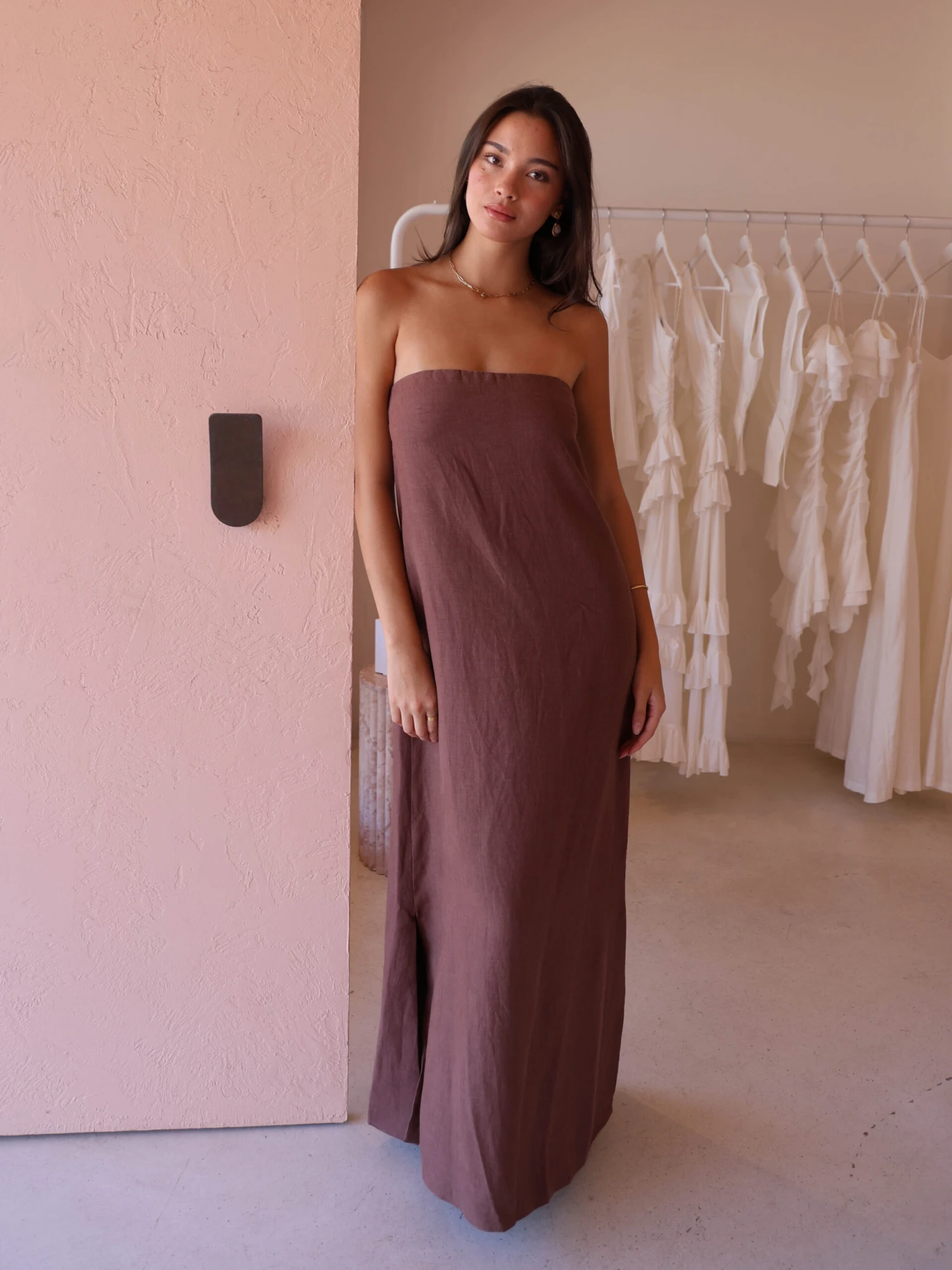 New Romantics Marc Strapless Maxi Dress in Chocolate is the effortless cool girl look leading you into your summer events.