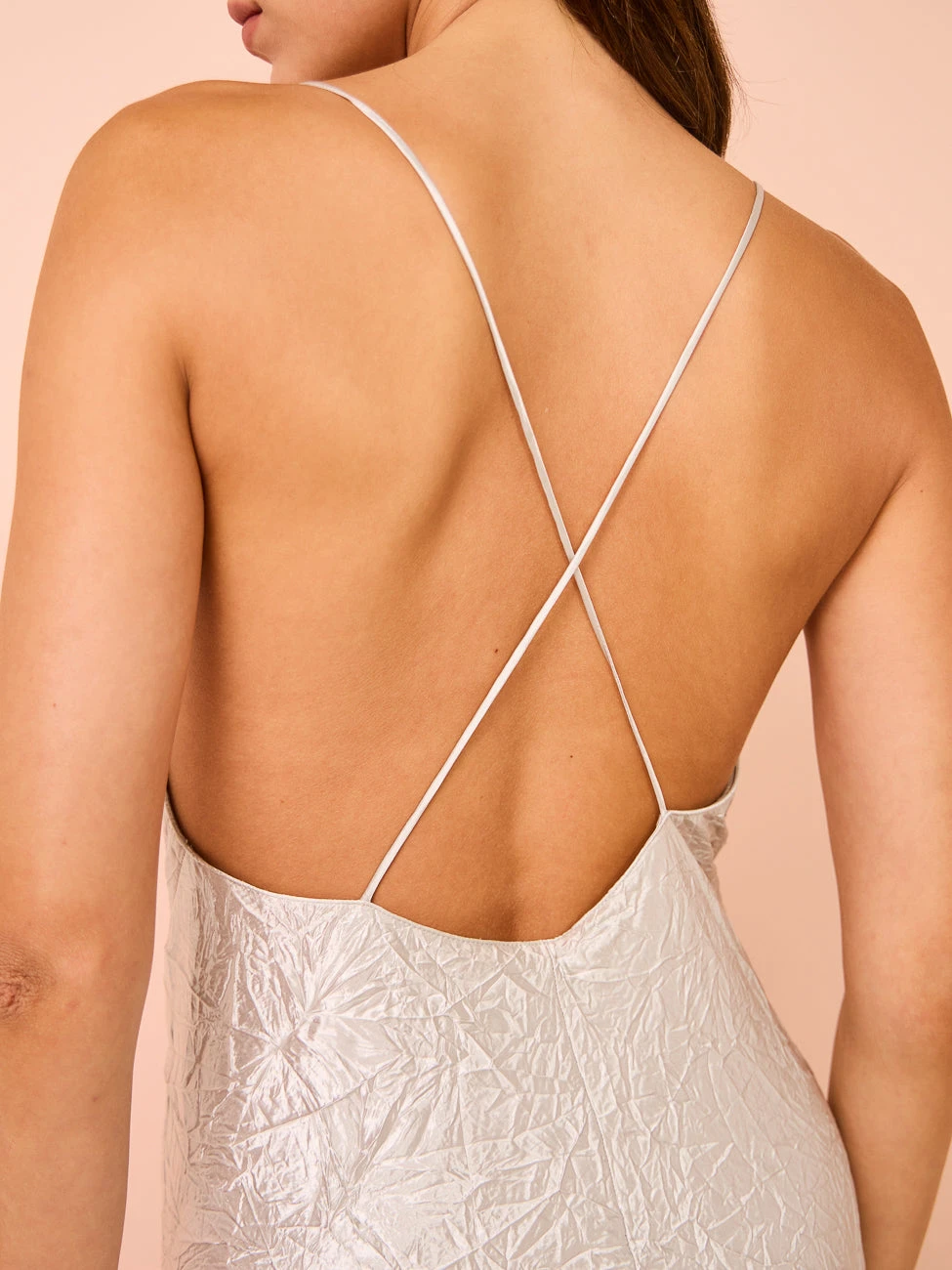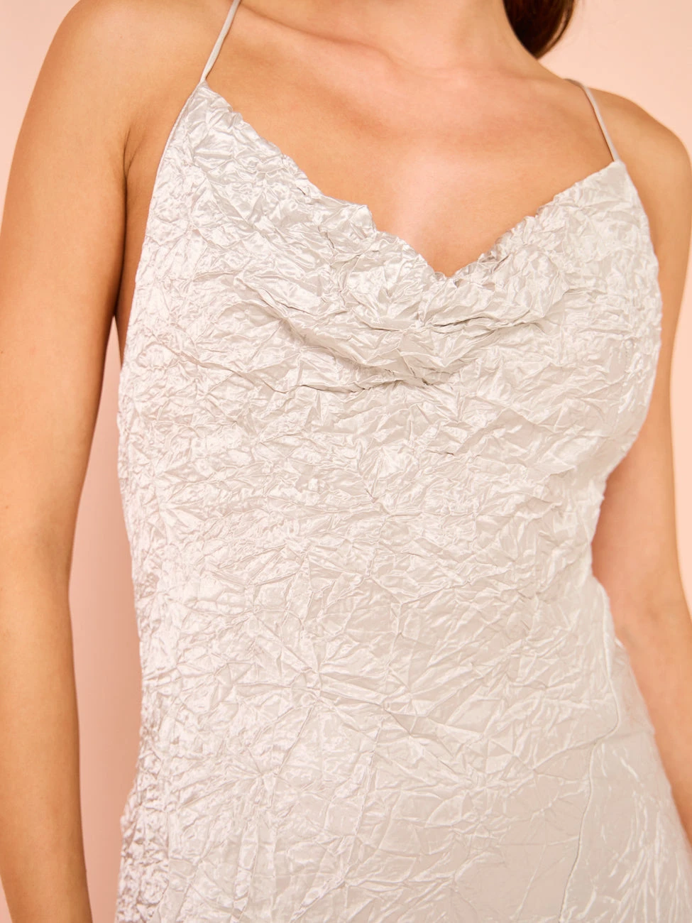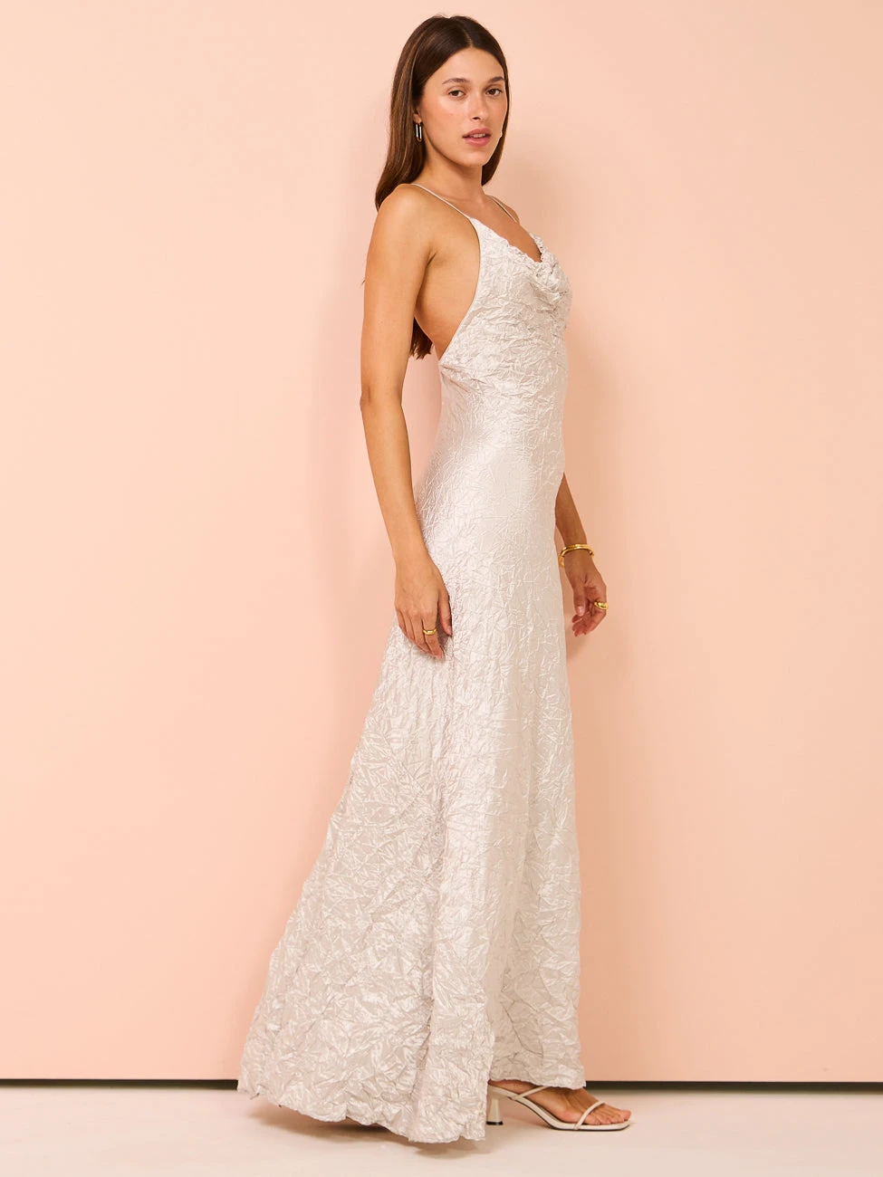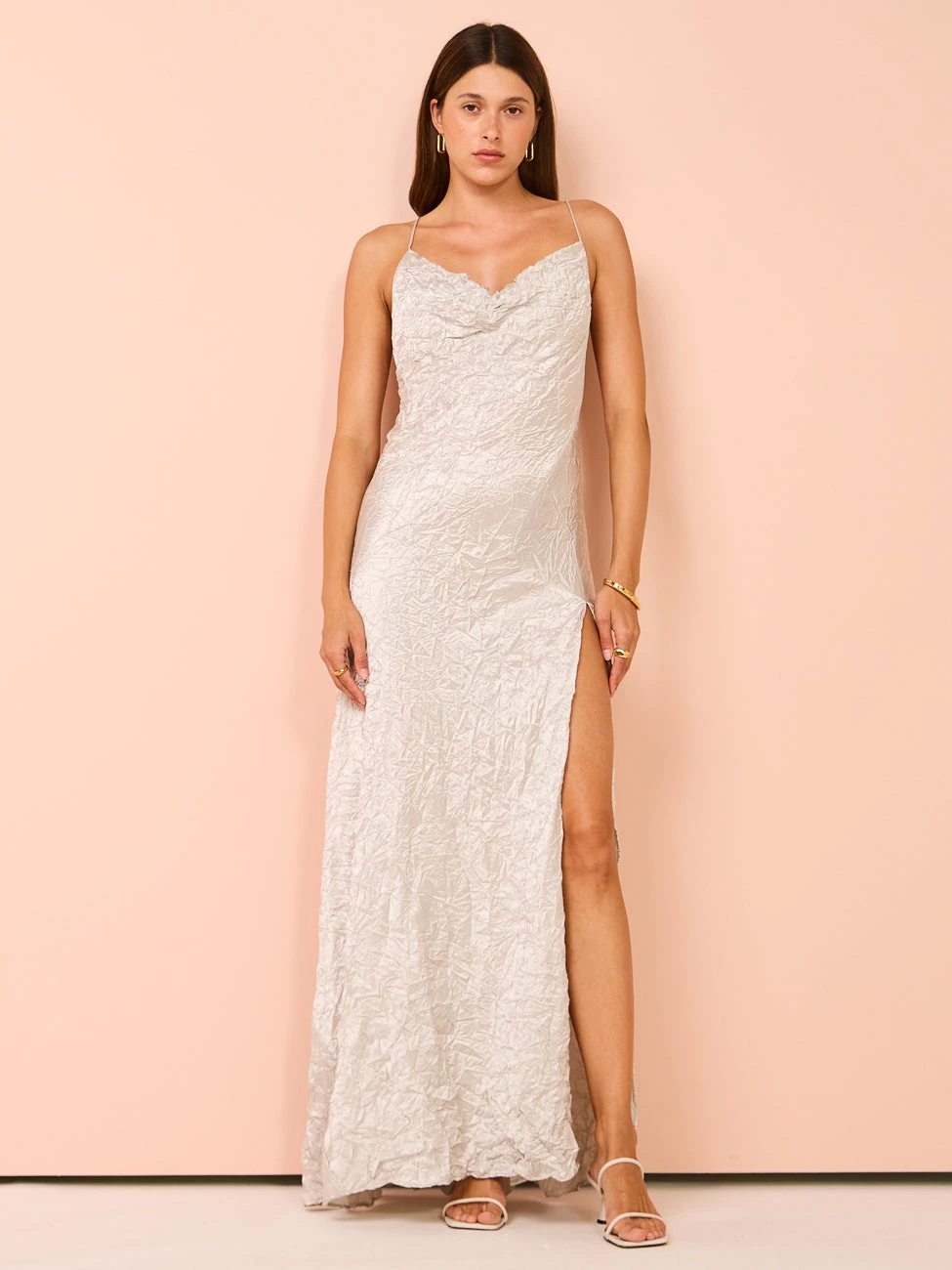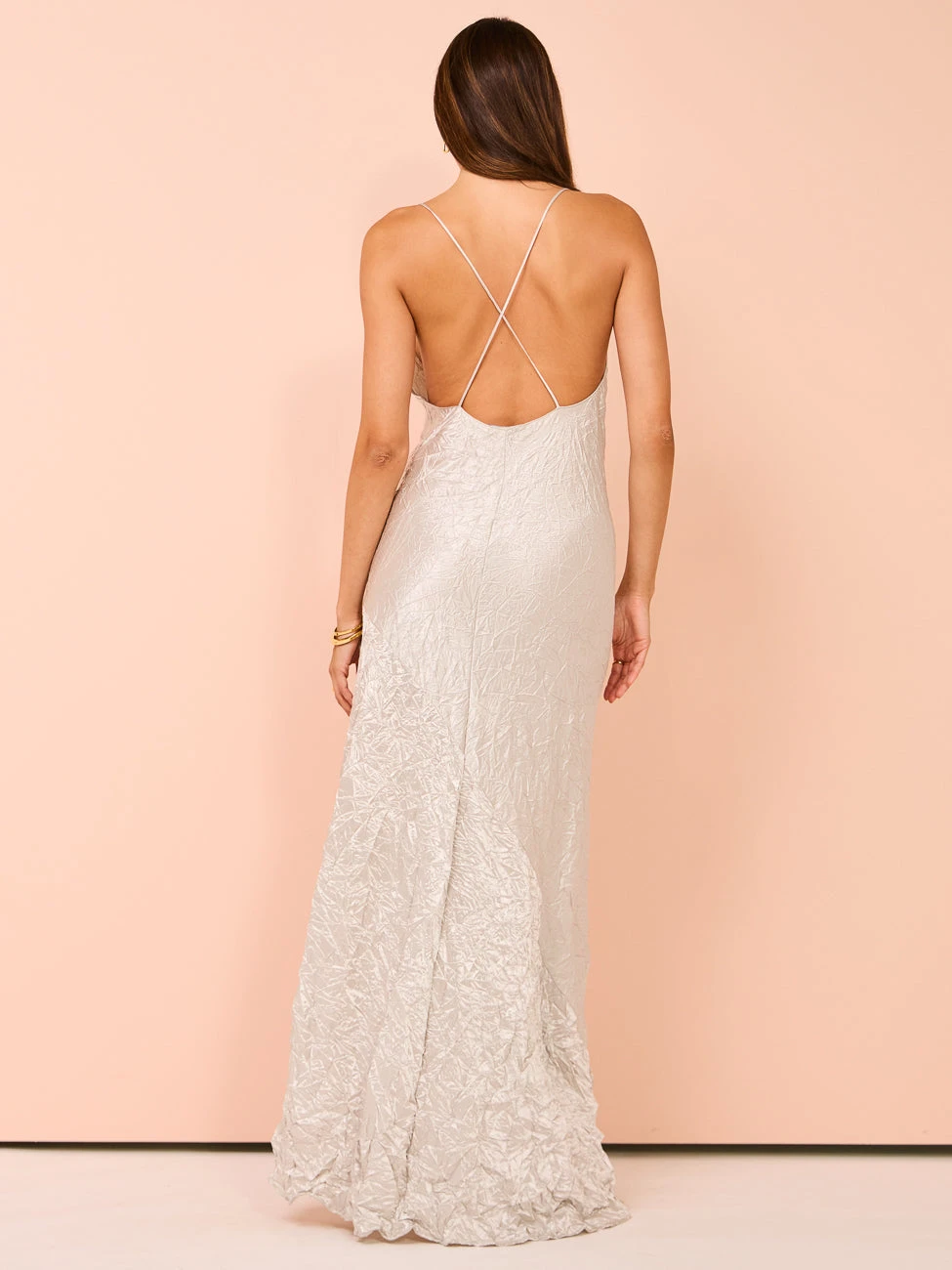 Carefully crafted from a medium to lightweight fabrication with a high shine crinkled finish, this maxi dress features a timeless draped neckline with thin crossed straps and complimenting low-cut back.