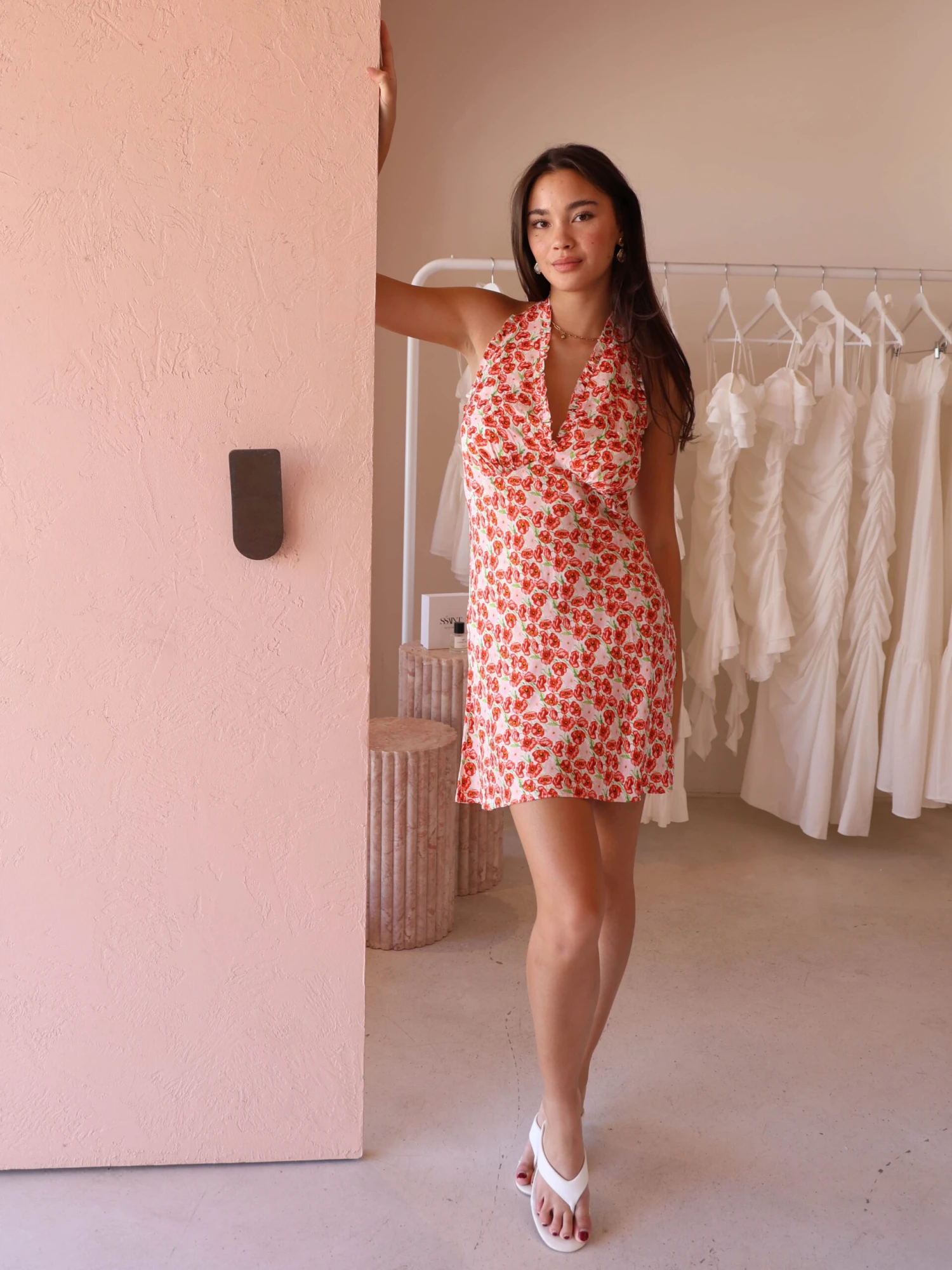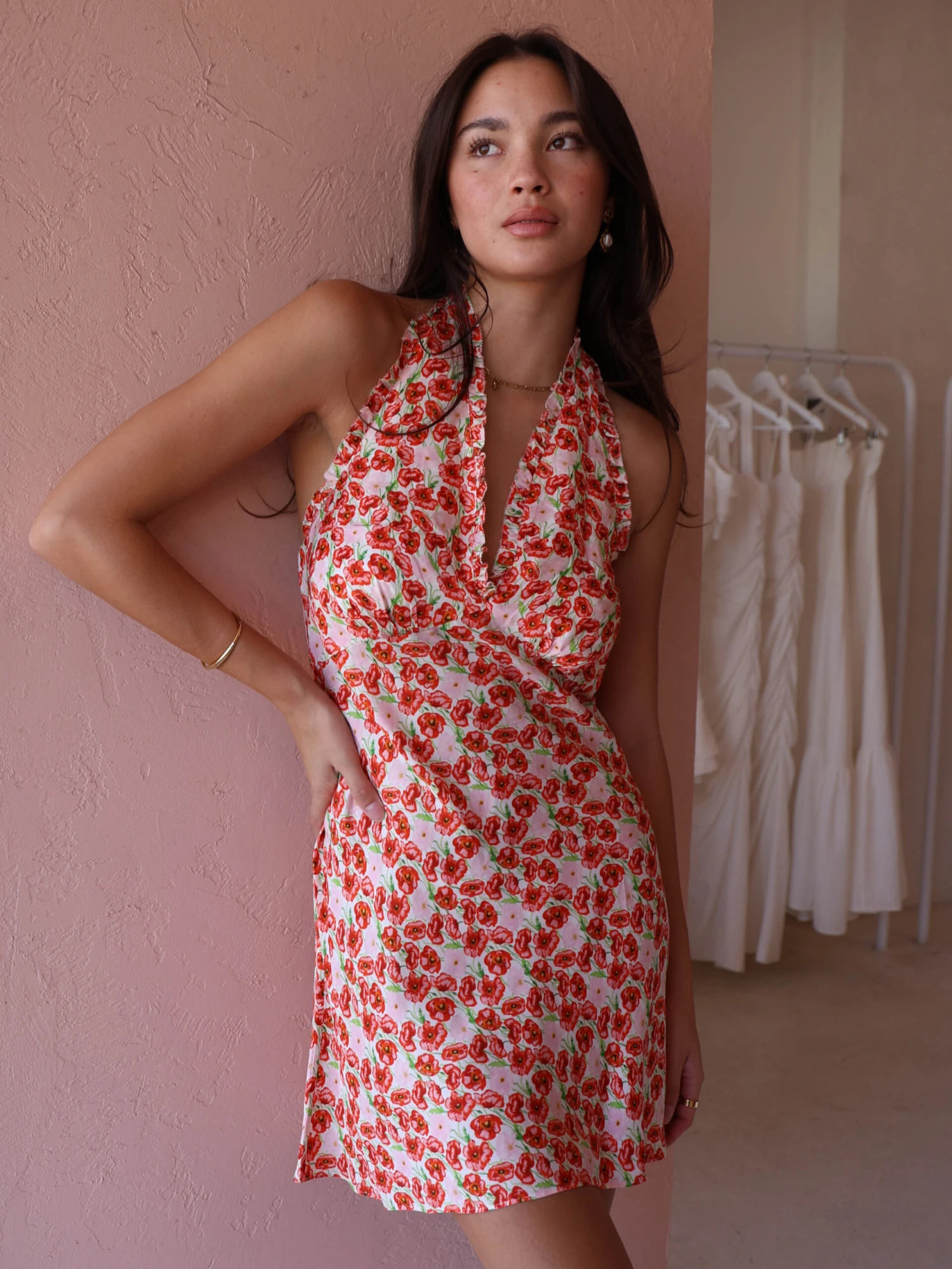 This stunning mini dress features a one-of-a-kind, exclusive poppy print, bringing a vibrant and feminine touch to your look.
