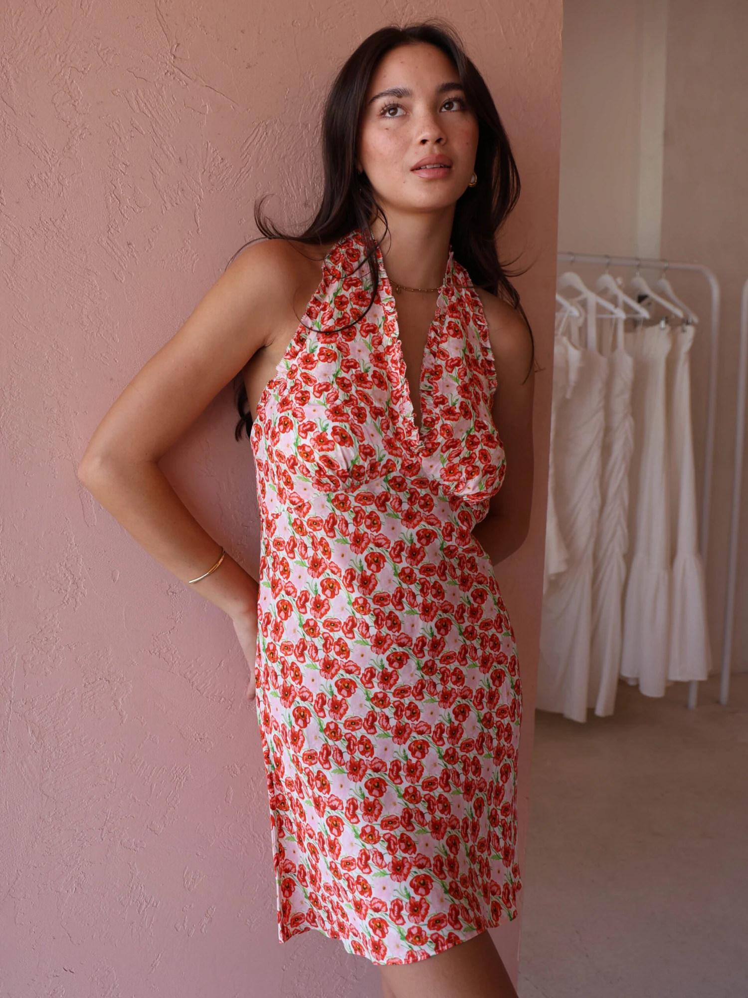 The delicate ruffled halter neck design offers a flattering silhouette while adding a playful and romantic detail that’s perfect for any occasion.