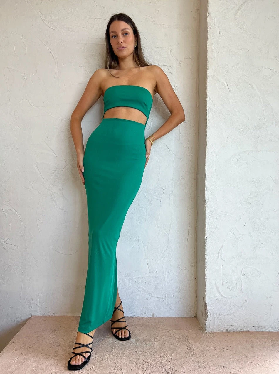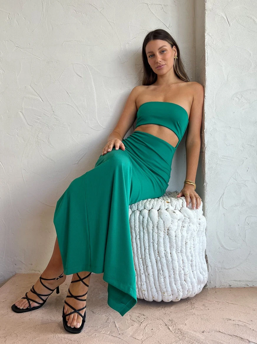 Crafted from a soft to touch fabrication, this strapless maxi dress comes in a graceful green hue and features a cut-out detail at the torso, a back slit, and a zip closure at the center back.