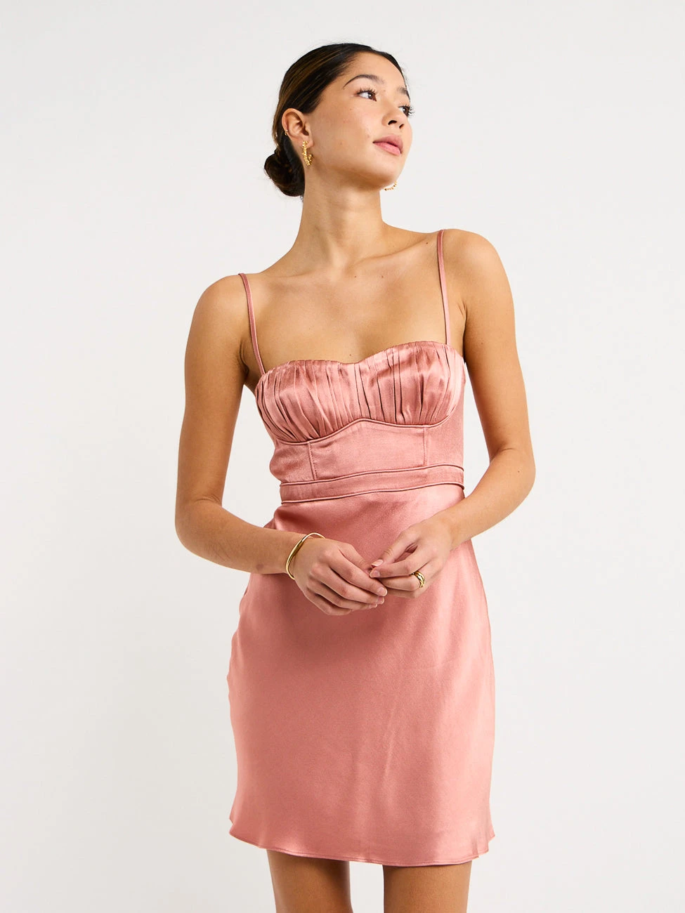 Float effortlessly through life’s special moments with the Shona Joy Ruched Mini Dress in Antique Rose.