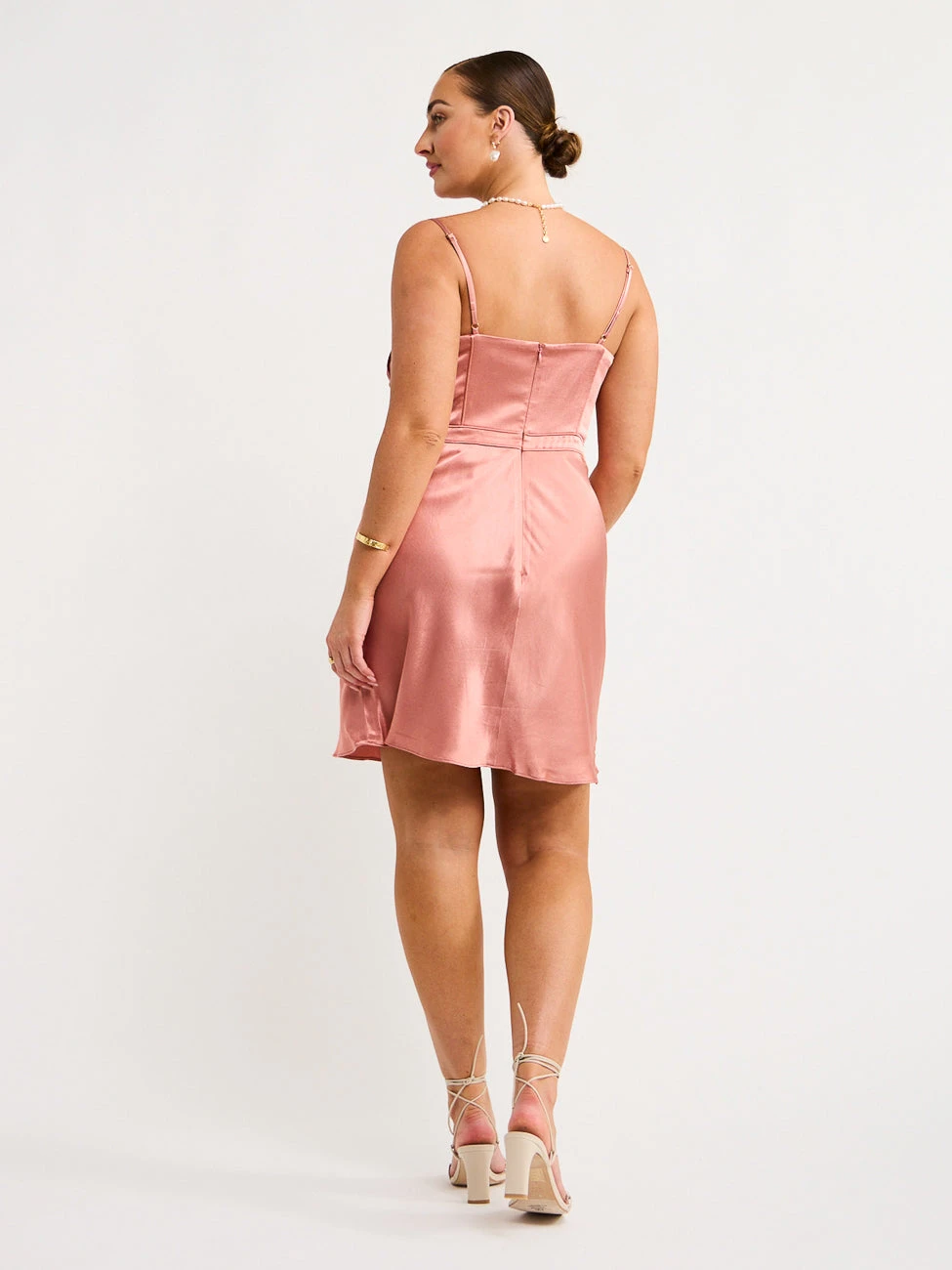 Delicately crafted from a silk-to-touch fabrication, this mini dress features a sweetheart neckline, adjustable rouleau straps and a ruched corded detail at the bust.