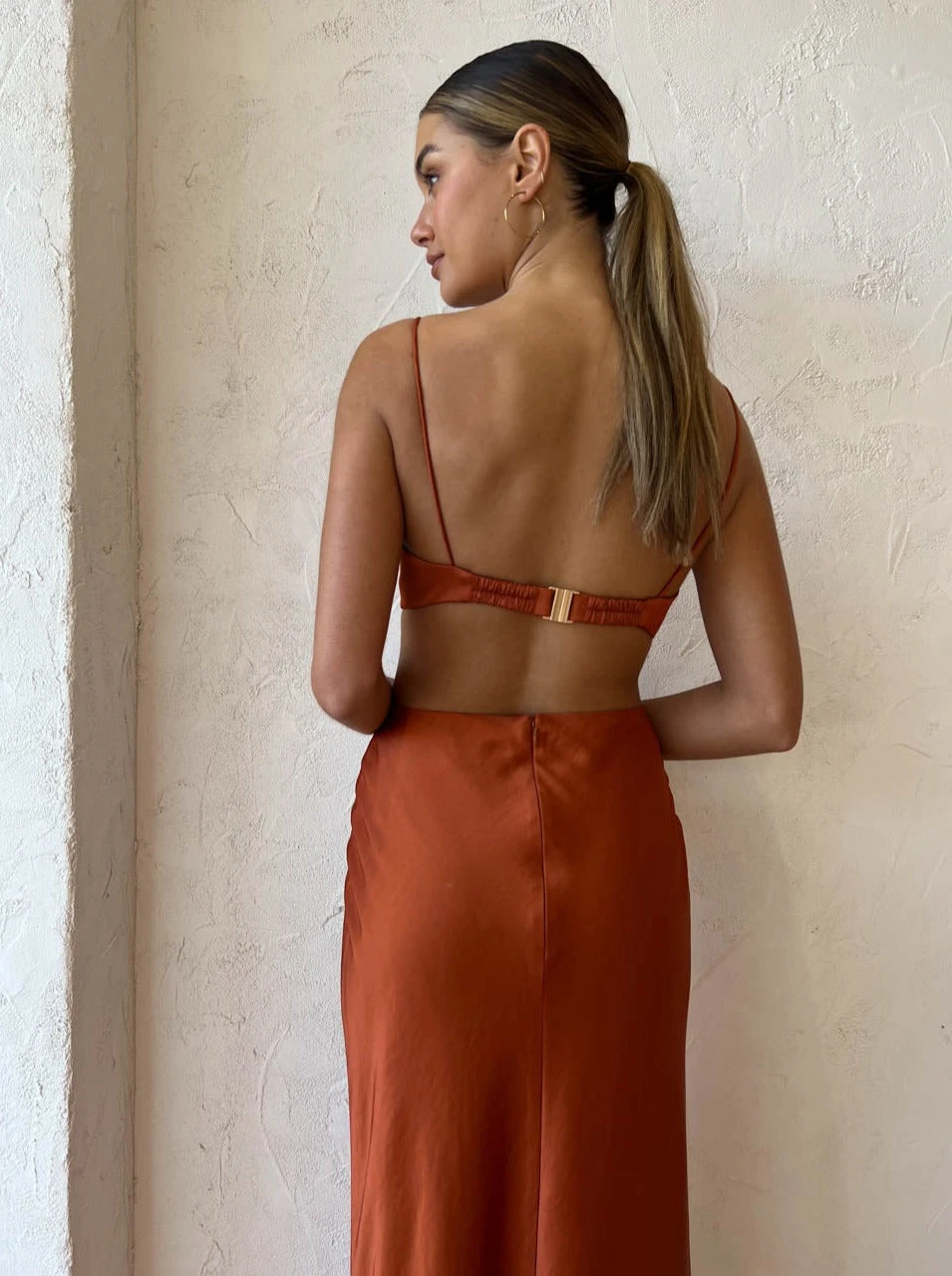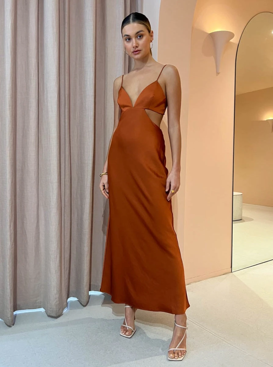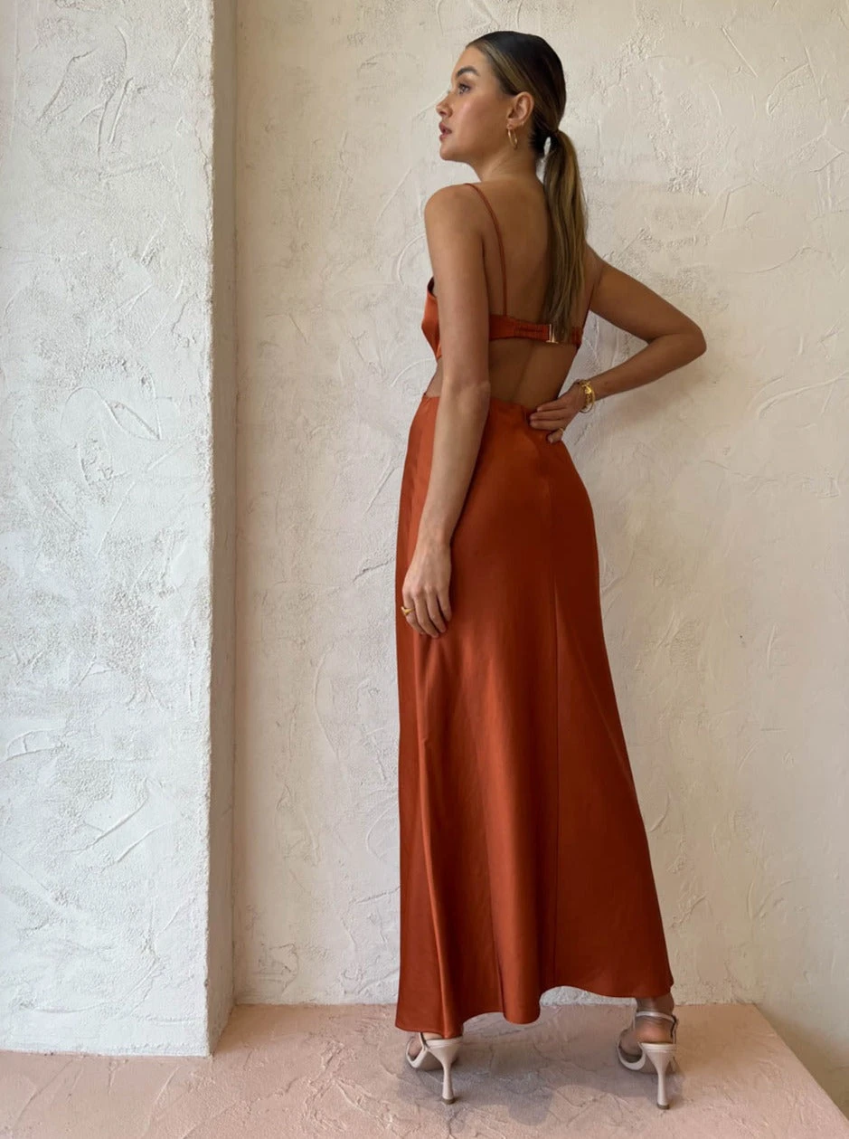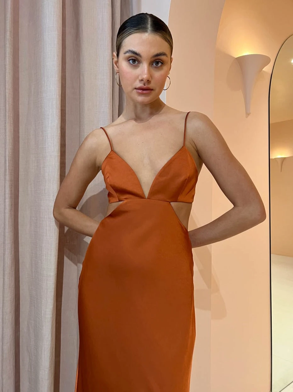 Crafted from a silky to touch fabrication, this effortlessly refined midi dress skims and flatters the body in all the right ways. Highlighting the décolletage with a soft curved plunging neckline it features slim straps, fitted bodice and waist cut outs that wrap around to the back of the dress.